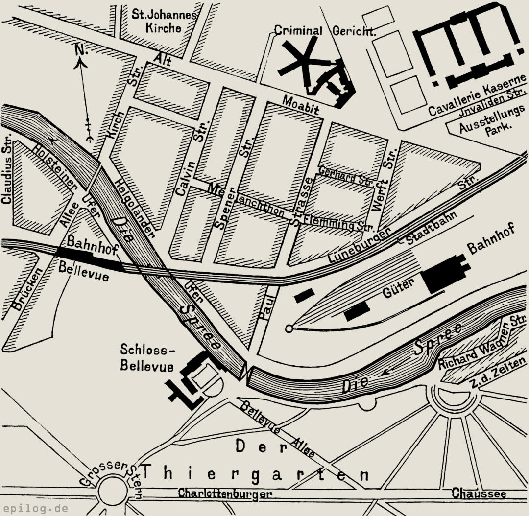 Abb. 1. Lageplan. Die bei weitem kürzeste Verbindung des Potsdamer Platzes und des Lützowplatzes mit dem Kriminalgericht lies sich aber herstellen, wenn im Zuge der Paulstraße (Abb. 1) in unmittelbarer Nähe des Schlosses Bellevue eine bereits im Bebauungsplan vorgesehene Brücke über die Spree zur Ausführung gelangte.