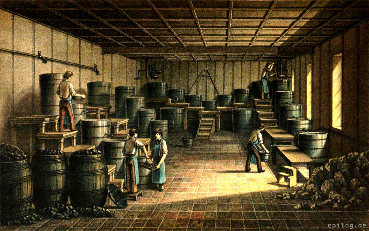 Die Schlemme der Bleistift-Fabrik A. W. Faber.Auf der linken Seite sieht man den Graphit in Originalfässern, auf der rechten Seite den Ton. Diese beiden Rohmaterialien werden hier geschlemmt und kommen alsdann in Pfannen zum Trocknen.