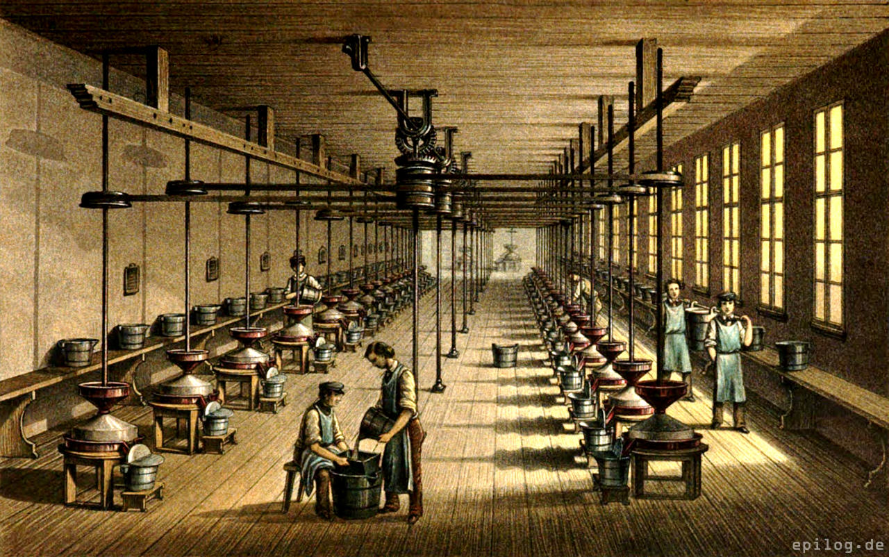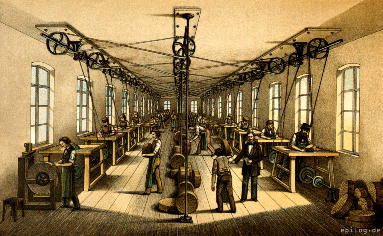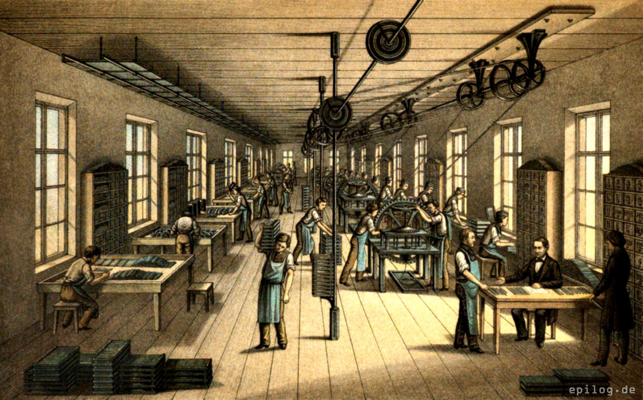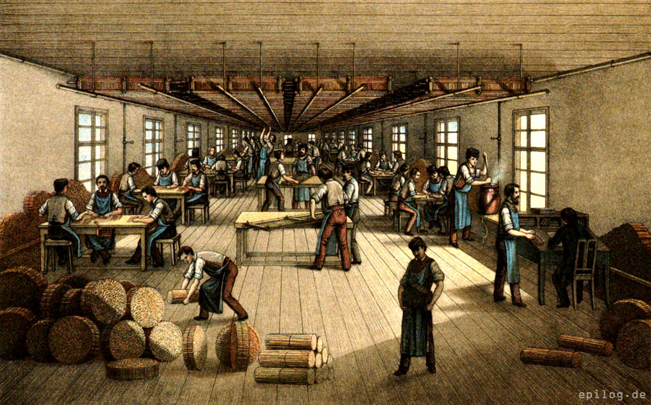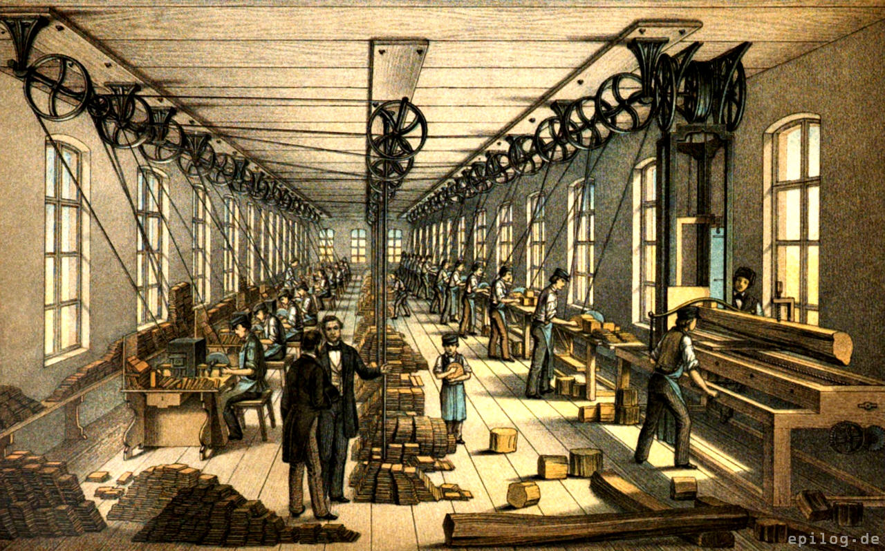 Die Feier des hundertjährigen Bestehens der Bleistift-Fabrik von A. W. Faber zu Stein bei Nürnberg gab dem Besitzer derselben Veranlassung, die folgenden Bilder anfertigen zu lassen, welche eine getreue Ansicht der hauptsächlichsten Arbeiter-Lokalitäten darstellen, und vermittelst deren es möglich sein dürfte, sich eine klare Vorstellung von der Bleistiftfabrikation zu machen.