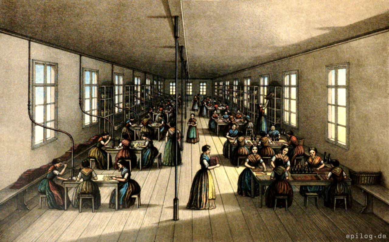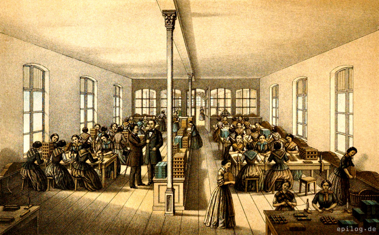 Rechts die Arbeiterinnen, welche die Bleistifte mit Farbe polieren, und links jene, die dieselben vermittelst einer Hebelpresse mit dem Fabrikzeichen stempeln.