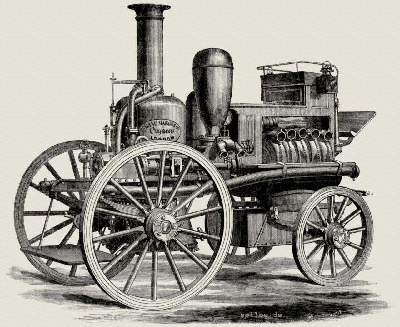 Auf der Wiener Weltausstellung befinden sich mehrere von oben genannter Firma ausgestellte Dampffeuerspritzen, die sich durch bemerkenswerte Verbesserungen auszeichnen, welche hauptsächlich in einer leicht zugänglichen Ventilanordnung und in der Vermeidung des Schwungrades bestehen, wie aus der perspektivischen Ansicht der ganzen Maschine (Abb. 1) ersichtlich ist.