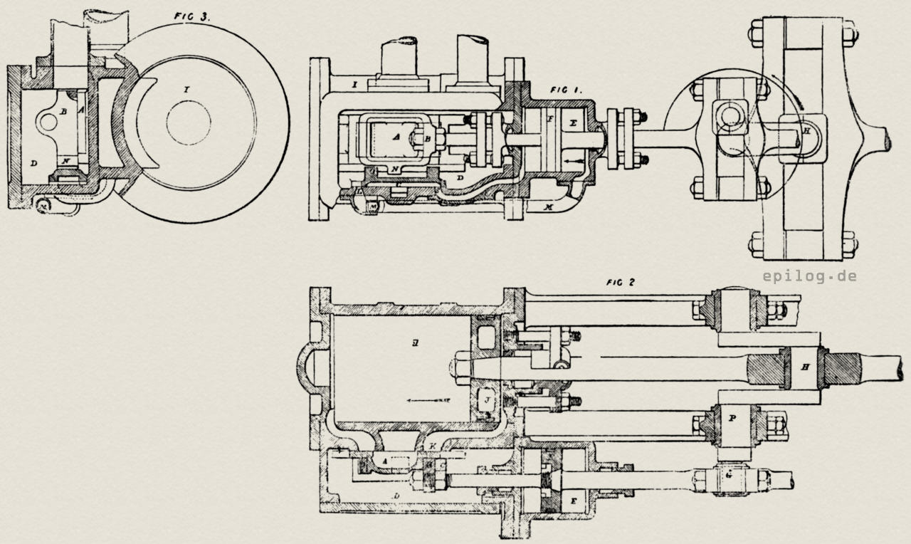 Die Art und Weise, wie man das Schwungrad umgangen hat, verdeutlichen Abb. 2. Fig. 1 u. 2. Die Kurbel ist in dem toten Punkt durch einen auf der Schieberstange sitzenden Kolben unterstützt, welcher bewirkt, dass die Schieberstange, außer als solche, auch noch als Kurbelstange tätig ist; als erstere erhält sie ihre Bewegung von der eigentlichen Kurbelstange, während sie in der Funktion der letzteren diese wieder ersetzt. Abb. 2. Fig. 1 ist ein teilweiser Vertikalschnitt der Steuerung, Abb. 2. Fig. 2 ein Horizontalschnitt und Abb. 2. Fig. 3 eine Endansicht und teilweiser Querschnitt derselben und des Zylinders.