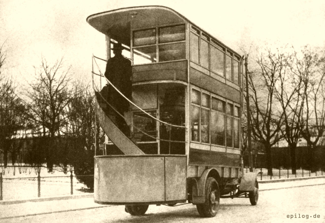 Nun war freilich noch eine Gefahr zu bedenken, über die immerhin zu sprechen wäre. Die Treppe, die in das Stockwerk hinaufführt, wurde als unpraktikabel, ja als halsbrecherisch bezeichnet. Man sagte, dass ein Sturz von dieser Treppe fast unbedingt verderblich sein würde, denn der Unglückliche, der durch eine plötzliche Wendung des Autobusses oder auch nur durch einen kleinen ›Rucker‹ aus dem Gleichgewicht geriete, müsste unfehlbar auf die Straße hinunterstürzen, was besonders bei rascher Fahrt tödlich sein könne. Obzwar es noch selten vorgekommen sein dürfte, dass jemand von der Treppe eines Imperial-Omnibusses auf die Straße stürzte, war man in anerkennenswerter Weise doch bemüht, auch diese Gefahr zu beseitigen, und aus diesen Bemühungen entstand unsere hier wiedergegebene neue Imperial-Autobustype mit Sicherheitsstiege.