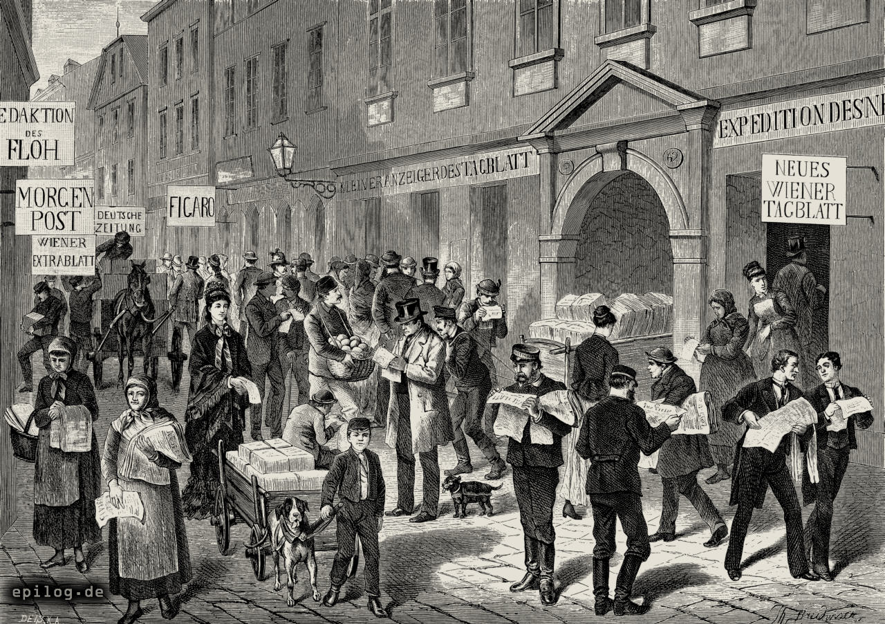 Von Tagesgrauen bis zur Nacht ist hier ein Wogen von Fußgängern und Wagen von und zu den Redaktions- und Expeditions-Büros, den Druckereien usw., und die Austräger und Austrägerinnen von jedem Alter eilen in den bestimmten Stunden wetteifernd herbei, um sich ihren Bedarf an Exemplaren zu holen. Gleichzeitig werden auf Handkarren und Fuhrwerken aller Art die Zeitungspakete nach der Post und zu den Zeitungsverschleißern der entlegeneren Stadtteile und Vorstädte verschickt, denn die Verteilung und Verbreitung der politischen Zeitungen erheischt einen gut organisierten Apparat von Privatagenten in den Tabakverschleiß- und Spezereiläden oder in eigenen Büros der entlegeneren Quartiere und Hauptstraßen, von wo aus die Zeitungen dann erst durch einen Stab von Kolporteuren und Austrägern weiter verbreitet werden. Zur Stunde der Ausgabe der neuen Nummern aber wimmelt die Straße auch von einzelnen Personen, welche entweder vor Begierde brennen, die neuesten Tagesbegebenheiten zu erfahren und die neuesten Stellenangebote kennenzulernen und die sich darum entweder eine Nummer von der betreffenden Zeitung kaufen oder vor der angeklebten neuesten Nummer stehen, um deren Spalten zu durchmustern. Unter diesen Stellensuchern von auswärts sind nun aber sehr viele, die nicht lesen können und daher nach irgendeiner mitleidigen Seele sich umsehen, welche ihnen die betreffenden Stellenangebote finden hilft und verdolmetscht. Zur Zeit aufregender politischer Ereignisse aber verwandelt sich dieser ameisenhaufenartige Menschenverkehr der Zeitungsgasse sehr oft in einen reißenden Strom oder eine wogende Brandung von Menschen, gewährt aber jederzeit einen interessanten Einblick in das Wiener geistige, industrielle und Volksleben.