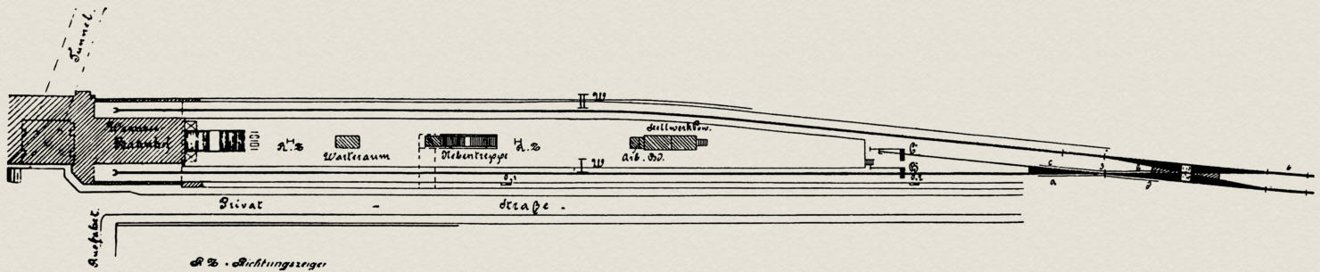 Der Richtungszeiger (Abb. 2) trägt für jedes Gleis die erforderlichen Arme, auf denen das Ziel des betreffenden Zuges angegeben ist, und einen Arm mit der Aufschrift: ›Leerzug. Nicht einsteigen!‹ Diese Arme werden durch zwei am Fuß des Gestells aufgestellte gewöhnliche elektrische Hauptsignalantriebe (1) – d. h. für jedes Gleis einen – bewegt. Außerdem trägt der Richtungszeiger noch zwei höher sitzende, von den übrigen vollständig unabhängige Arme mit den Aufschriften: ›Dieser Zug fährt zuerst ab‹, welche durch einen unter der Bahnsteigoberfläche aufgestellten elektrischen Weichenantrieb (2) bewegt werden. In der Ruhelage hängen alle Arme senkrecht herab und legen sich gegen hölzerne Anschläge (3) am Gestell.