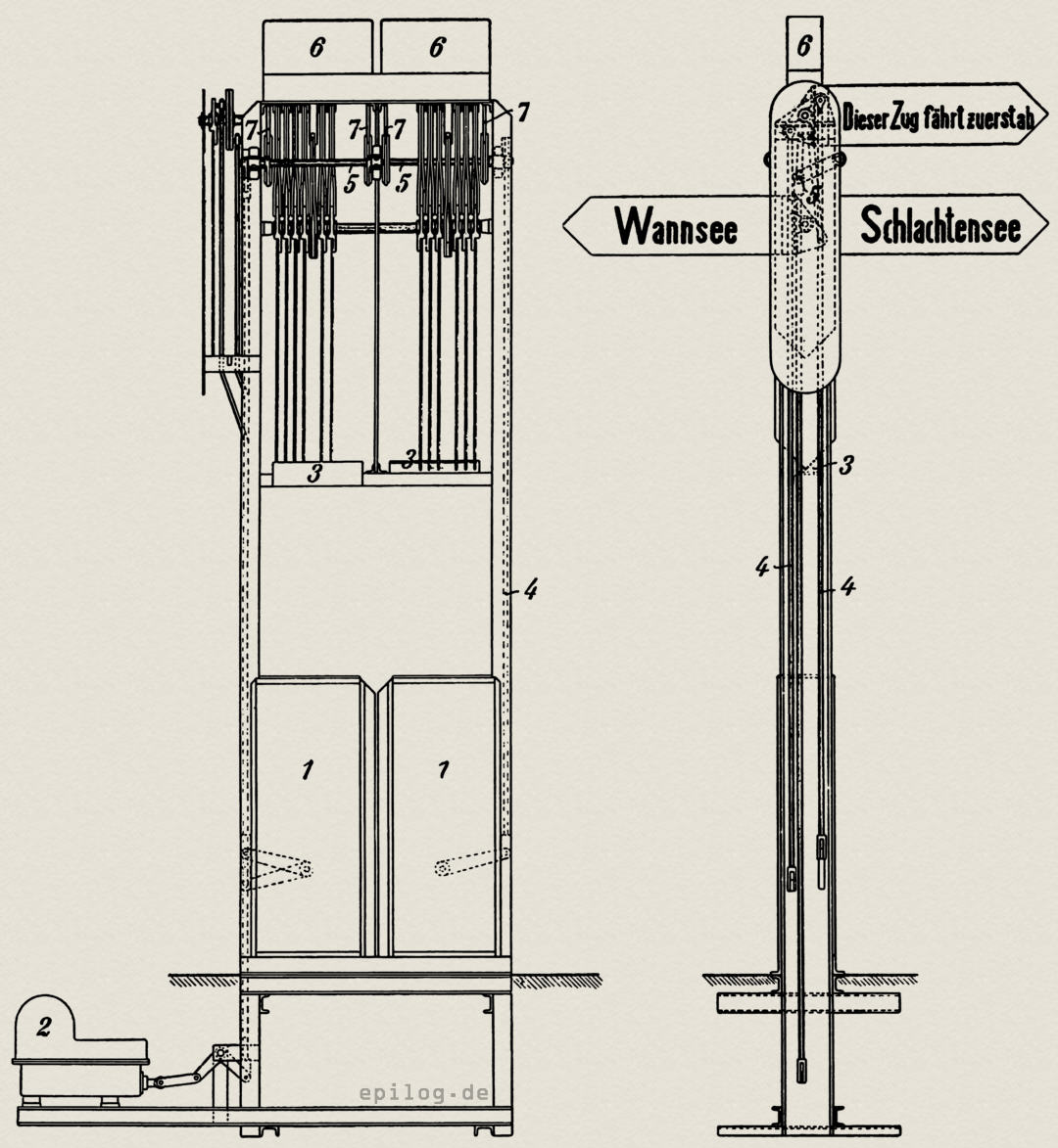 Richtungsanzeiger. falls mehrere Züge nach derselben Richtung in Frage kommen, zugleich anzeigen, welcher Zug zuerst abfährt. Diese Richtungszeiger werden gewöhnlich von den Bahnsteigschaffnern oder den Bahnhofsarbeitern bedient. Auf dem Wannseebahnhof in Berlin waren zwei Richtungszeiger derart aufgestellt (Abb. 1), dass sie den Reisenden, welche die Zugangstreppen heraufkommen, sofort in die Augen fallen und auch von den Bahnsteigschaffnern zur Bedienung leicht zu erreichen waren. Bei der engen Zugfolge auf der Wannseebahn bis zu 3½ Minuten, ist es naturgemäß auf dem Anfangsbahnhof öfter nicht zu vermeiden, dass von der festgesetzten Bahnhofsfahrordnung abgewichen und hierbei auch die Richtungszeiger umgestellt werden müssen. Dies stieß bei den handbedienten Richtungszeigern auf große Schwierigkeiten, da jedes Mal ein Bote vom Stellwerkturm am Ende des Bahnsteigs, von wo aus der Fahrdienst geleitet wird, zu den Bahnsteigschaffnern gesandt werden musste und die nachträgliche Änderung des gezogenen Richtungszeigers für die Reisenden äußerst lästig ist.