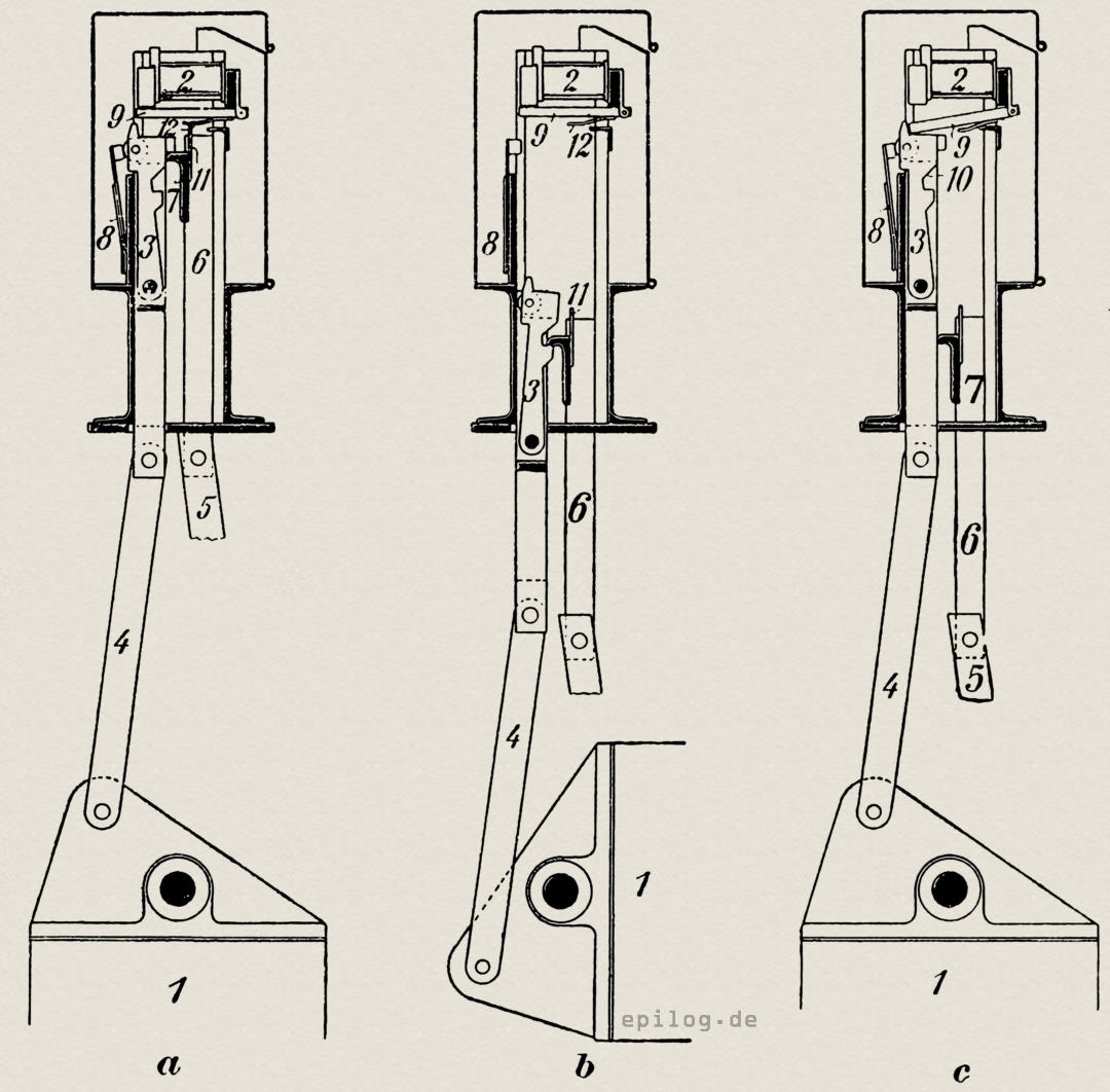 Die elektrische Wählereinrichtung (Abb. 3) besteht für jeden Arm (1) aus einem Elektromagneten (2), der die Kupplung des Armes mit dem Antriebe einleitet, und einer Kuppelklinke (3), durch welche das zum Arm führende Gestänge (4) mit dem vom elektrischen Antrieb durch die oben angegebene Welle (Abb. 2⁵) bewegten Gestänges (5) (Abb. 2⁷) gekuppelt wird.