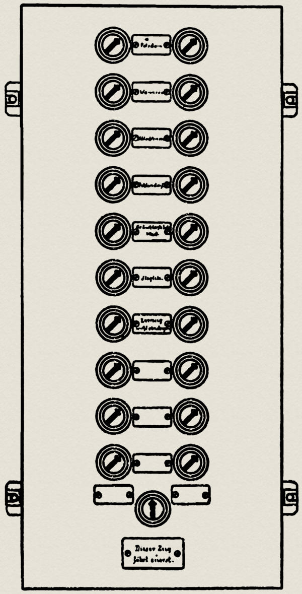 Zum Schließen des Stromes der Wählermagnete und der Antriebe dient ein im Stellwerkturm angebrachter Umschalter (Abb. 4), in welchem für jeden Arm eine Schaltwalze vorhanden ist. Die Walzen werden, wie bei den neueren elektrischen Stellwerken, durch die aus dem Deckel des Kastens herausragenden Knöpfe bewegt. Die Schalter für die Arme eines Gleises sind untereinander angebracht. Für die beiden Arme: ›Dieser Zug fährt zuerst ab!‹ ist ein gemeinsamer Schalter vorgesehen, welcher nach rechts oder links gedreht werden kann.