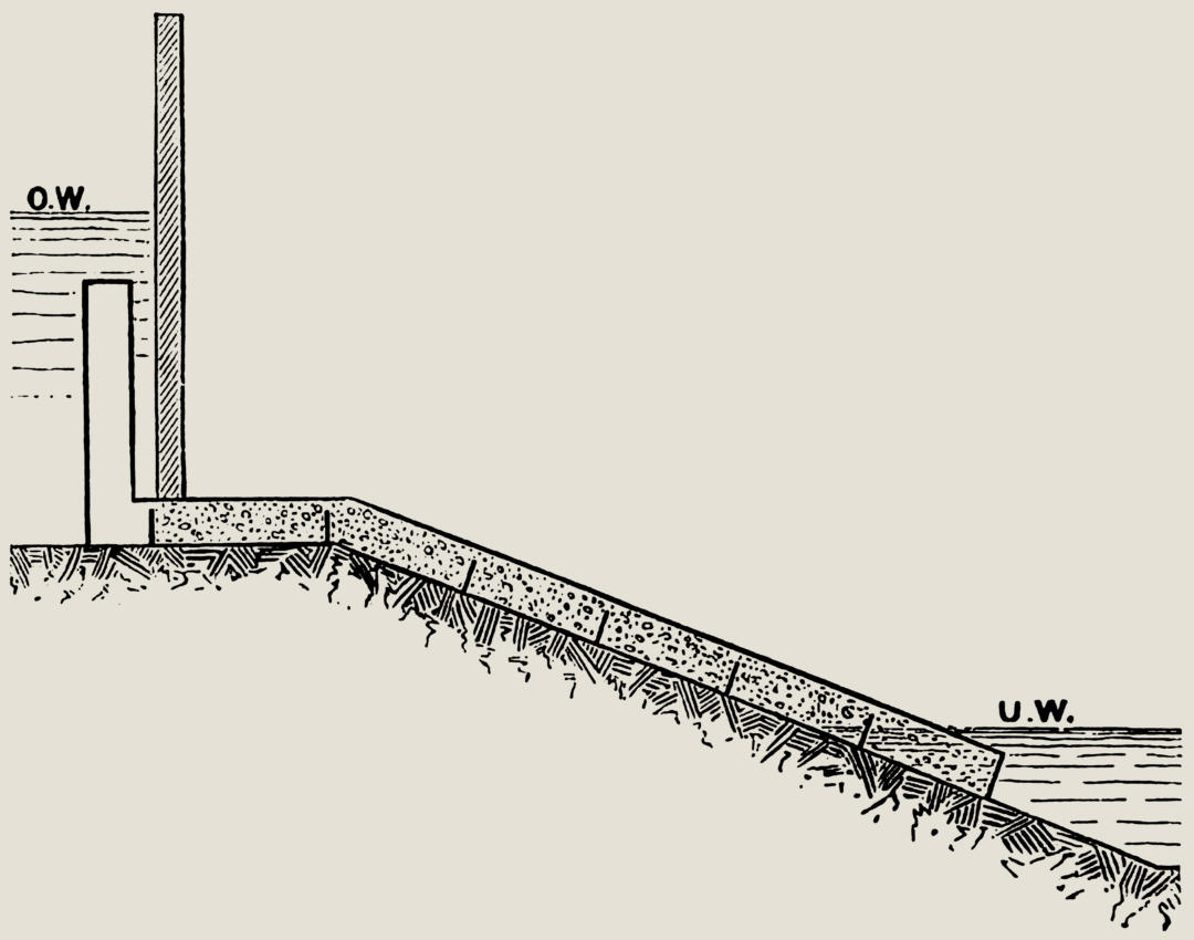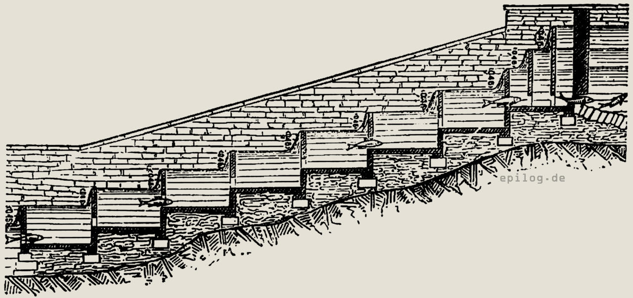 An vielen Stellen hat die Natur selbst bei Wasserfällen oder Wehren für natürliche Fischtreppen gesorgt. Oft stürzt das Wasser auf den Felsen von Stufe zu Stufe herunter und bildet durch die Wucht seines Anpralls mitten in den einzelnen Absätzen mehr oder weniger tiefe Grundlöcher, die man Kolke nennt und die mit verhältnismäßig ruhigem Wasser gefüllt sind. Der wandernde Fisch springt nun die kleineren Stufen hinauf, und wenn er müde geworden ist, so bieten ihm die Kolke Gelegenheit zum Ausruhen. Auf diese Wahrnehmung stützten sich nun die ersten Erbauer von Fischtreppen, deren Bau beifolgende Bildchen (Abb. 1 u. 2) trefflich veranschaulichen.