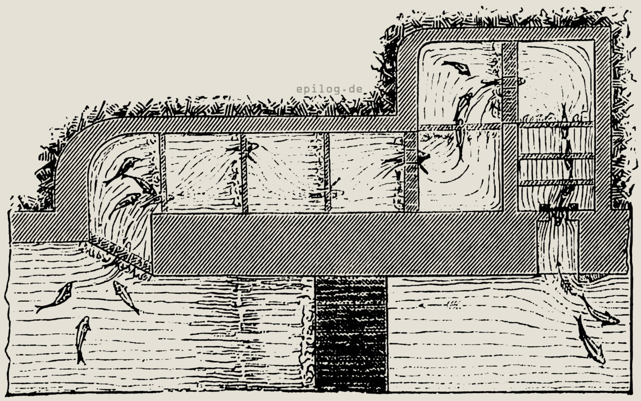 Wir sprachen oben von der Hartnäckigkeit, mit welcher die Wanderfische ihr Ziel verfolgen. In einer auf Veranlassung des Deutschen Fischerei-Vereins von H. Keller herausgegebenen kleinen Schrift ›Die Anlage der Fischwege‹, welcher wir die Abbildungen zu diesem Aufsatz entnehmen, werden einige merkwürdige Beispiele von der Ausdauer der Fische aufgeführt.