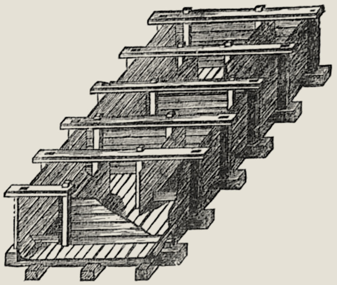 Abb. 3. Hölzerner Fischpass. Aber selbst bei größeren Wasserfällen ist die Anlage eines Fischpasses höchst einfach. Sie besteht aus einer sanft aufsteigenden Holzrinne, an deren Seitenwangen bald rechts, bald links Querbrettchen angenagelt werden, durch welche die Strömung gebrochen wird. Man kann, um diese Wirkung zu erhöhen, auch in der Mitte der Rinne einige Brettchen befestigen, wie dies auf Abb. 3 veranschaulicht wird. Der Fisch schwimmt nun in dem ruhiger gewordenen Wasser des Passes im Zickzack von der einen Öffnung zur anderen, bis er den Ausgang des kleinen Labyrinths oberhalb des Wasserfalls erreicht. Der größte Fischpass dieser Art ist der Fischweg am Rukan-Fall in Norwegen. Der Fischpass umgeht diesen Wassersturz, dessen Gefälle über 27 m beträgt, zum Teil in Zickzacklinie, das heißt in derselben Weise, wie die Alpenstraßen eine Höhe überwinden. Die Anlage ist zwar nur 285 m lang, der Fisch hat aber, wegen der Windungen in dem Pass selbst, einen beinahe dreimal längeren Weg, nämlich 785 m, zurückzulegen. Dieser Aufgabe unterzieht er sich aber mit Meisterschaft, und es ist, dank der Anlage, der obere Lauf des Sire-Flusses nunmehr mit Fischen reich bevölkert.