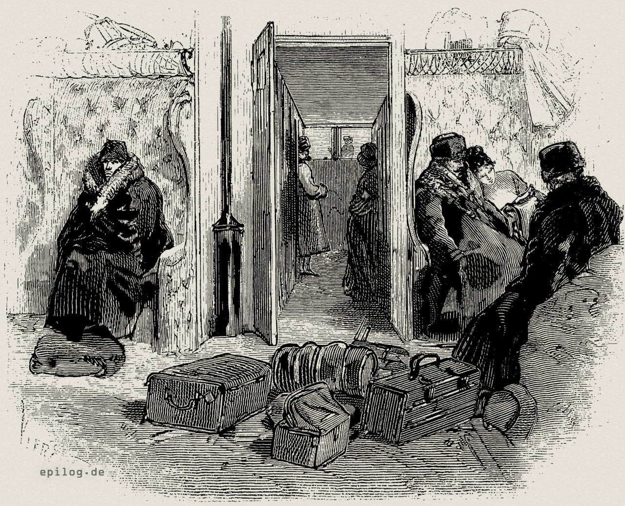 Inneres eines russischen Eisenbahnwaggons. Unsere erste Abbildung gibt eine Ansicht von dem Inneren eines Schlafcoupés in einem derartigen Wagen. An der Fensterseite sind zwei behagliche Fauteuils angebracht; an der Innenseite zwei Bettkojen übereinander, welche mit Matratze, Hauptpfühl, Decke und Plumeau versehen und sehr behaglich und reinlich sind. Eine ähnliche Einrichtung besteht schon seit einigen Jahren auch auf den Nachtzügen der Eisenbahn Petersburg –