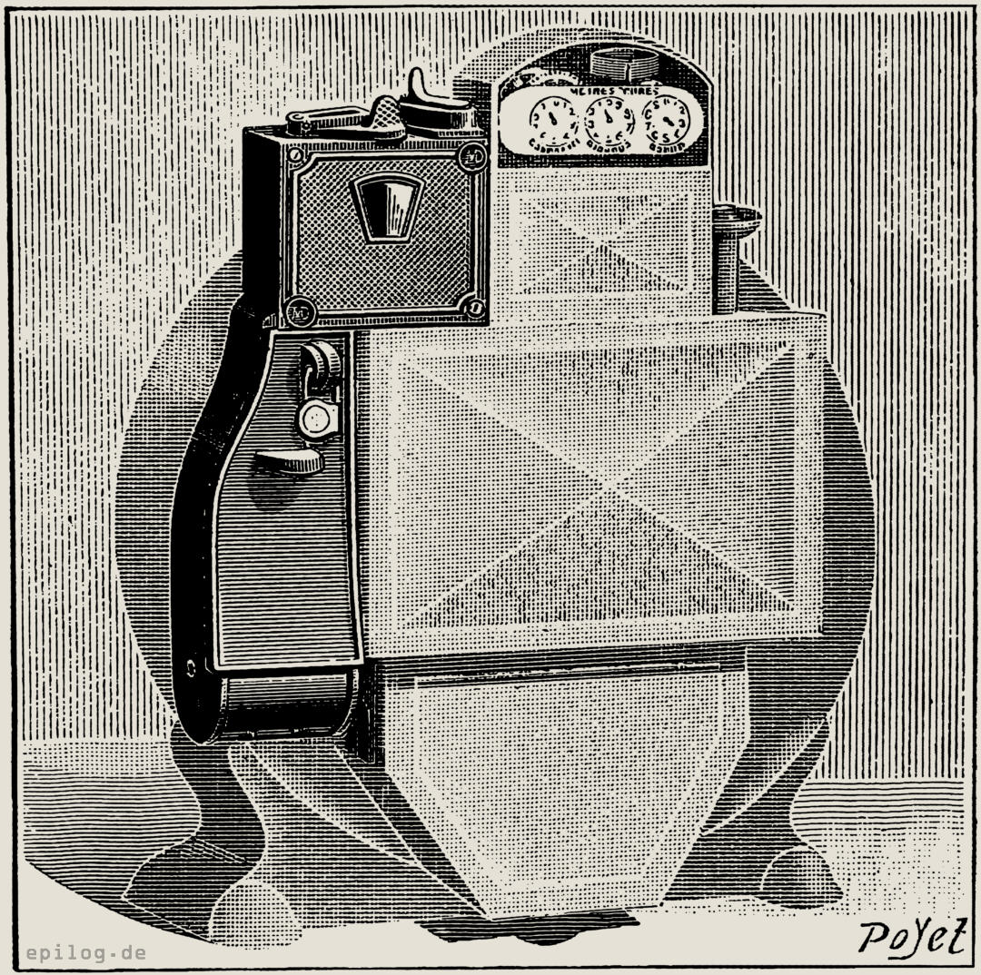 Man hat, um diesen Übelständen vorzubeugen, anfangs in England, dann auch bei uns und in anderen Ländern eine neue Art von Gasuhren in Aufnahme gebracht, welche das Leuchtgas nur in bestimmten Mengen gegen Vorausbezahlung liefern und sich vortrefflich bewährt haben. Es sind dies die sogenannten Gasautomaten, deren Konstruktion die Verbindung eines gewöhnlichen Gasmessers mit der Einwurfvorrichtung der bekannten Verkaufsautomaten bedeutet. Man hat nur ein Zehnpfennigstück oder diejenige Münze, für welche der Gasautomat eingerichtet ist, in den Schlitz zu werfen und einen Hahn oder Hebel zu drehen, um das Gas zur Verfügung zu haben. Das eingeworfene Geldstück setzt dann die Messtrommel der Gasuhr in Bewegung und sperrt sie erst wieder ab, wenn die für das betreffende Geldstück verkäufliche Gasmenge verbraucht ist. Die Abb. 1 u. 2 geben die äußere Ansicht und den Mechanismus eines solchen Gasautomaten von Maldant und Dupoy wieder.