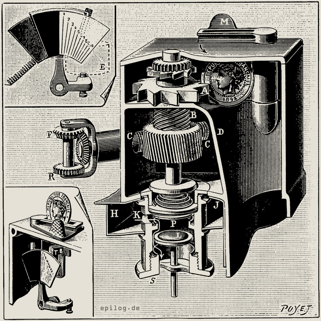 Damit ist die innerhalb dieses Rades liegende Federtrommel teilweise aufgezogen, setzt die Spindel B in Bewegung und hebt das Verschlussventil P auf, so dass das Gas ungehinderten Zutritt zur Trommel findet. Ein Zählwerk geht mit der Rotation der letzteren Hand in Hand und setzt einen unter dem Geldeinwurf befindlichen Hebel in Bewegung, welcher die bei E sichtbare Zähltafel langsam mit einem schwarzen Schieber überdeckt. Gleichzeitig mit dem Verschwinden der Ziffern hat auch der für den Geldeinwurf zu liefernde Gasstrom sein Ende erreicht, eine Arretierungsvorrichtung setzt das Schraubenrad C in Bewegung und senkt die Klappe P wieder um so viel herab, dass der Gaszufluss abgesperrt ist.
