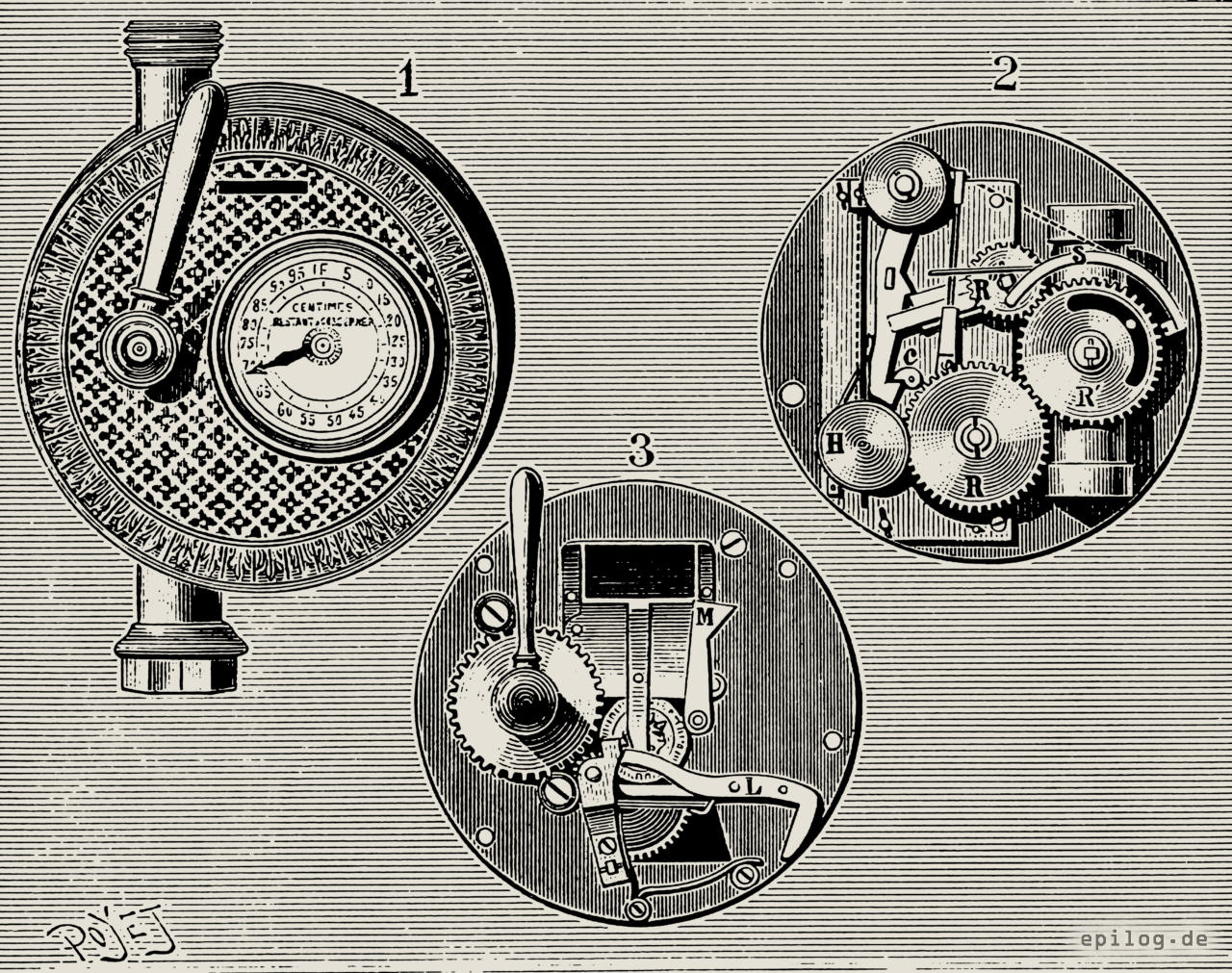 Abb. 3. Gasautomat von Hour. Gleichzeitig mit dieser Bewegung des Hahnes aber wird die Feder eines kleinen Uhrwerks aufgezogen, das aus den Rädern R R’ und dem Pendel H besteht. Solange dies Uhrwerk läuft, ist der Hahn geöffnet, gleichzeitig mit seinem Ablauf wird er geschlossen. Besonders sinnreich ist dabei die Vorrichtung, die es ermöglicht, das Uhrwerk je nach dem schnelleren oder langsameren Gasverbrauch ebenfalls schneller oder langsamer ablaufen zu lassen. Ohne diese Vorrichtung würde derjenige, der den Gashahn weit geöffnet hält und etwa die doppelte Anzahl Flammen anschließt, für sein Geld auch die doppelte Gasmenge erhalten. Um das zu verhindern, ist am Konus des Haupthahnes durch den Bügel S eine feine Kette befestigt, welche das lose auf seiner Stange sitzende Gewicht des Pendels um so höher zieht, je weiter der Hahn geöffnet ist. Das Uhrwerk läuft alsdann entsprechend schneller und der stärkere Gasverbrauch wird durch das raschere Ablaufen der Räder aufgewogen.