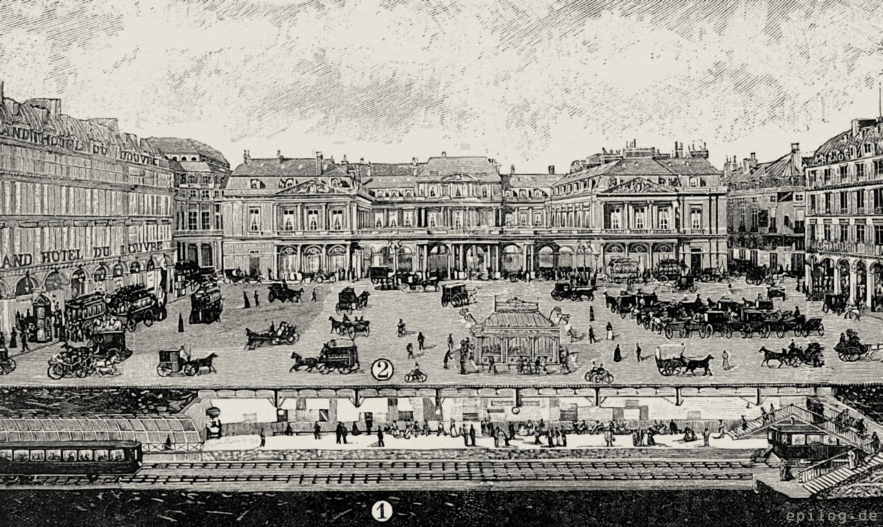 Das eine Bild gibt eine Ansicht der Pariser Untergrundbahn bei der Station auf dem Platz vor dem Palais Royal, während das andere Bild die Station bei dem Triumphbogen de l’Étoile darstellt. Der Durchschnitt des Straßenuntergrundes lässt hier die Bahnanlage erblicken, wobei im ersten Bild oberhalb auch noch zwei Kanalisationstunnels sichtbar sind, die mit der Bahnanlage nichts zu tun haben.