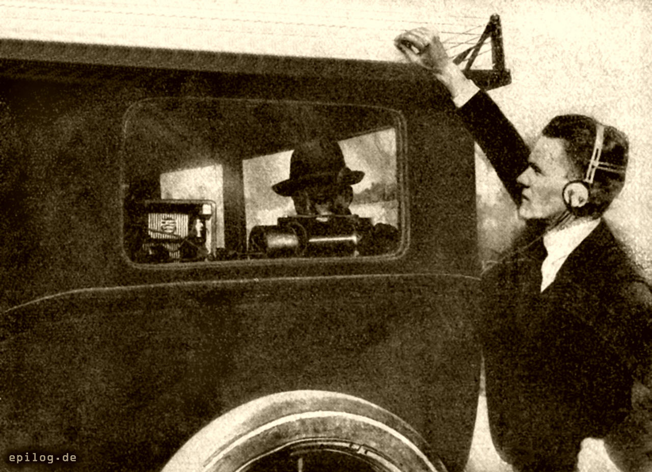 Drahtrahmen auf einem Automobil, der als Antenne zum Empfangen und Geben der Gespräche dient. Jetzt konnte man einen Schritt weitergehen und auch an die drahtlose Verbindung mit Kraftwagen aller Art denken. Für große Firmen beispielsweise, die Hunderte von Geschäftswagen täglich unterwegs haben, muss es sehr wichtig sein, den einzelnen Kutscher jederzeit anrufen und ihm neue Weisungen geben zu können. Die Mittel dazu sind bei dem gegenwärtigen Stand der Technik recht einfach. Eine Antenne in Form einiger flachgespannter Drähte auf dem Wagendach. Die ganze Apparatur in einem kleinen Holzkasten unter dem Kutscherbock. Neben dem Kutscher ein lautsprechendes Telefon, in Rücksicht auf den Lärm der Großstadtstraßen noch mit einem Grammophontrichter ausgestattet, der dem Kutscher jeden Befehl der Firma in das Ohr schreit. Diese durch die unten stehende veranschaulichte Einrichtung ist bereits bei vielen amerikanischen Firmen eingeführt. Aber auch die Patrouillenwagen der Polizei sind mit ganz ähnlichen Einrichtungen versehen. Während der Fahrt ist der Polizeiwagen jederzeit empfangsbereit. Jeder Befehl der Zentrale erreicht ihn sicher. Aber der Wagen kann auch selber senden. Zu dem Zweck muss er freilich halten und einen etwa 20 m hohen Antennenmast auskurbeln. Dann aber ist ein telefonisch Sprechen und Gegensprechen zwischen Wagen und Zentrale sofort möglich.