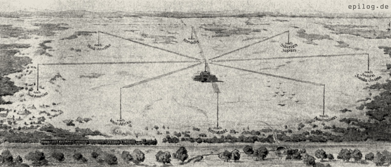 An einem regnerischen Märztage des Jahres 1906 lief ein Ingenieur, begleitet von einem Monteur, durch das Havelländische Luch bei Nauen, steckte mit einer Schnur Entfernungen ab und schlug schließlich einen Holzpflock in den sumpfigen Grund. Das war die Grundsteinlegung der funkentelegrafischen Station Nauen. Vierzehn Jahre später, am 29. September 1920, wurde hier die größte Funkenstation der Welt feierlich eingeweiht. Wo einstmals ein simpler Pflock den Grundstein markieren musste, erhebt sich jetzt ein schön stilisierter Riesenbau, in welchem 750 elektrische Pferdestärken in hochfrequent schwingende elektrische Energie umgesetzt werden. Über Stahltürme von 250 m Höhe dehnt sich ein Luftdrahtnetz, das die Fläche eines mittleren Rittergutes bedeckt, und die schwingende Energie, die aus diesem Gebilde herausstrahlt. trägt die Botschaften von Nauen um die halbe Erde. Nur noch Sendestation ist Nauen heute. Unaufhörlich schmettern die Maschinensender Tag und Nacht die Depeschen hinaus, geben bis zu zehn Millionen Wörter im Jahr. Dagegen werden die Nachrichten, die von den anderen Sendestationen der Welt nach Deutschland flattern, in der Empfangsstation in Alt-Geltow bei Potsdam aufgenommen. Man sieht wohl, dass in 14 Jahren mancherlei geworden, Beträchtliches geschaffen ist. Und die Frage wird laut: Wie wird es hier in abermals 14 Jahren, in 30 oder in 40 Jahren aussehen?