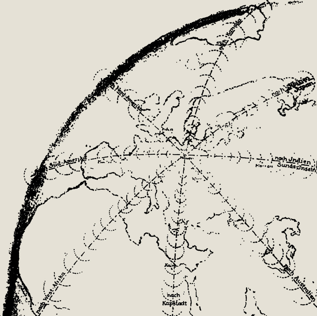 Und es wird auch die gerichtete Wellentelegrafie wirklich praktisch und betriebsmäßig möglich werden. Man wird die Erde beispielsweise von Nauen aus in acht Oktanten teilen, wie es unsere Abbildungen veranschaulichen. Die heutige Sendestation wird sich dann zur Sendestadt auswachsen. Vom Krafthaus aus werden sich sternförmig nach den acht Weltrichtungen hin acht gerichtete Antennen erstrecken. Nur nach der einen Richtung hinweg strahlt jede dieser Antennen ihre schwingende Energie, und je weiter die Technik fortschreitet, je genauer die Regulierung der Wellenlänge gelingt, um so schmaler wird auch das Gebiet werden, auf welchem die ausgestrahlte Energie bei ihrem Flug um die Erde konzentriert bleibt.