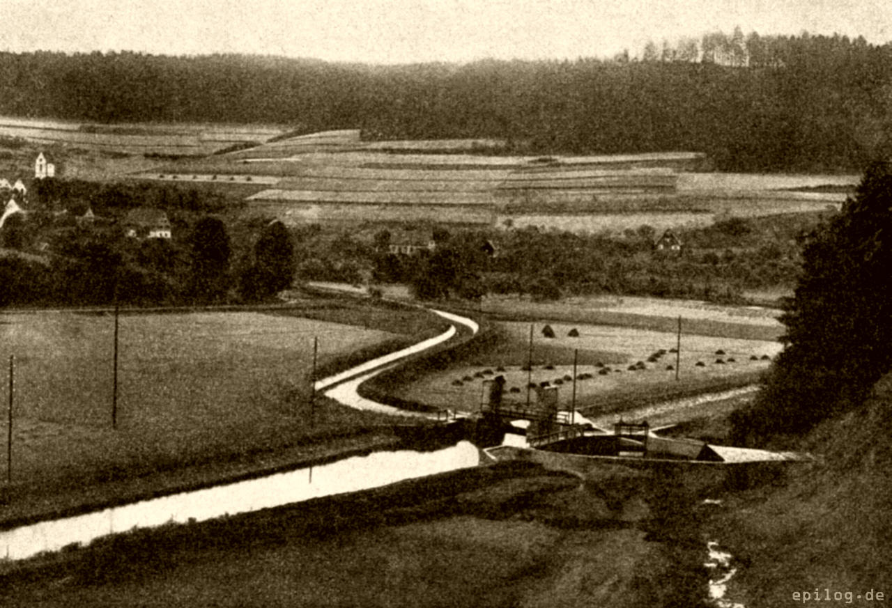 Abb. 2. Glatt-Lauterkanal bei Glatten, mit Lauterwehr und Stolleneinlaufbauwerk. Die nähere Untersuchung ergab, dass diese weder das vorhandene Gesamtgefälle noch die Wassermengen in besonders wirtschaftlicher Weise ausnutzen. Es konnte nachgewiesen werden, dass die Zusammenfassung der Gefälle die Leistung um ein Vielfaches erhöht und diese Mehrleistung der Allgemeinheit nutzbar gemacht werden konnte. Auch die Möglichkeit, das geplante Hochdruckwerk mit einem Speicherbecken zu verbinden und damit bessere Wasserwirtschaft zu betreiben, war durch die günstigen topographischen Verhältnisse des Heimbachtals gegeben. Es entstand somit auf Anregung des Verfassers der von Regierungsbaumeister Haußmann in Stuttgart angefertigte Entwurf, die Wasserkräfte von Glatt, Lauter und Heimbach zwischen Glatten und Sterneck einerseits und Bettenhausen anderseits mit einem Rohgefälle von rund 65 m unter Einfügung einer Talsperre im Heimbachtal auszunutzen, wobei die Möglichkeit bestand, im Heimbachtal Sperren von verschiedenem Ausmaß anzulegen. Erstrebenswert für die Wasserwirtschaft ist die Anlage einer möglichst großen Talsperre. Eine solche konnte mit einem nutzbaren Fassungsraum bis zu 16 000 000 m³ geschaffen werden. Leider musste der Plan zur Anlage dieser großen Sperre wegen der umfangreichen Vorarbeiten, der langen Bauzeit, sowie aus finanziellen Erwägungen vorerst zurückgestellt werden. Zur Durchführung kam die Anlage einer kleineren Sperre. Die Verwirklichung der großen Sperre ist dadurch nicht gehindert.