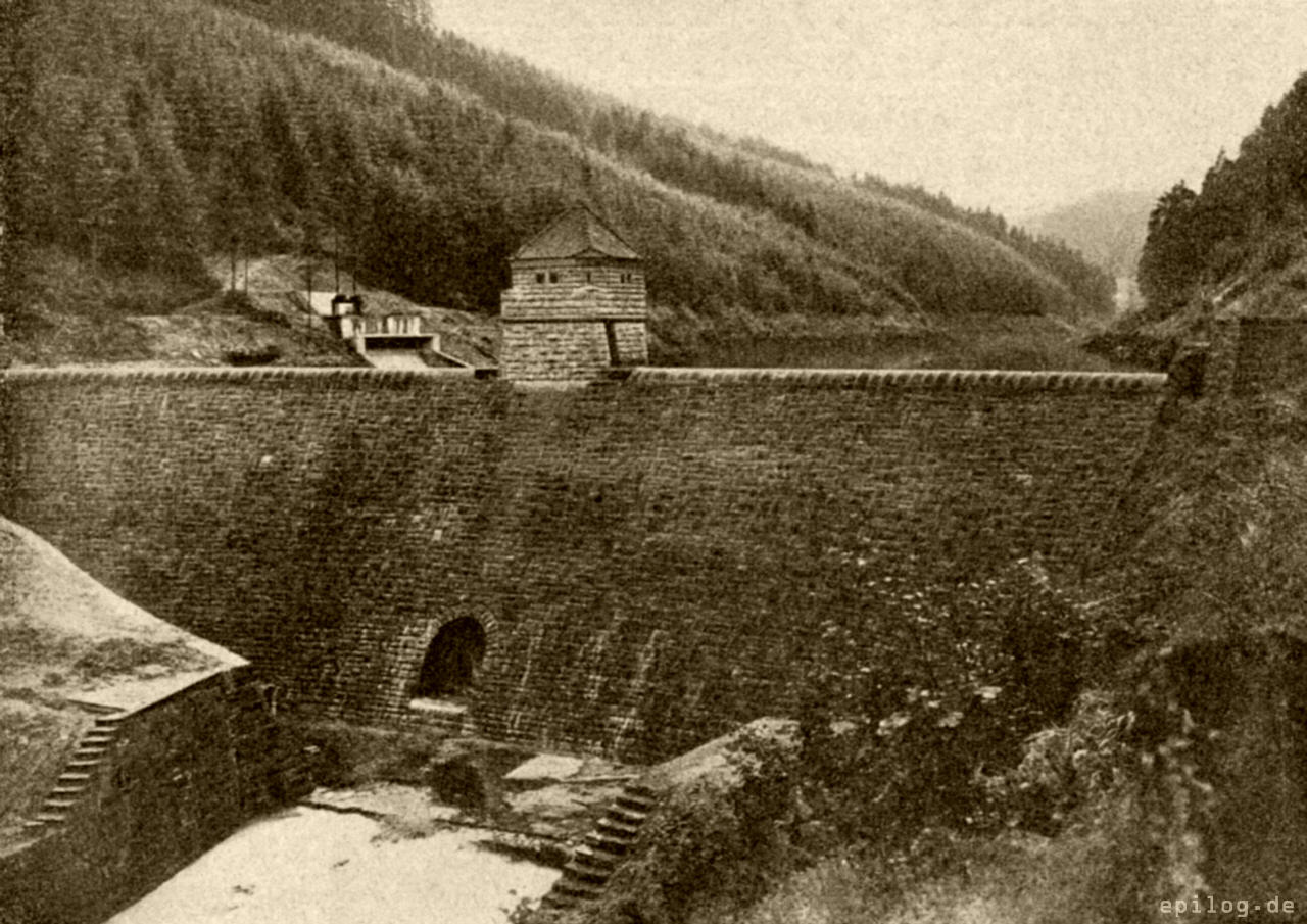 Die somit in das Heimbachtal umgeleiteten Glatt- und Lauterwasser werden dort in einer auf Abb. 3 wiedergegebenen Sperre von 158 000 m³ Fassungsraum aufgenommen und durch den Zufluss des Heimbachs vermehrt. Die erforderliche Sperrmauer wurde durchweg in Sandsteinmauerwerk aufgeführt, auf der Wasserseite sorgfältig gedichtet und an der Luftseite mit Buckelquadern aus roten Sandsteinen verkleidet. Ein Türmchen aus gleichem Material krönt das Bauwerk. Sowohl der eine Fläche von 45 000 m² bedeckende See, als auch die Sperre bilden entschieden eine reizvolle Bereicherung des stillen, von herrlichen Tannenwäldern eingesäumten Heimbachtales. Die Sperrmauer ist 15 m hoch und an der Sohle 11 m breit. Ein dem Beschauer nicht sichtbarer Betonsporn von etwa 28 m Länge ist als Fortsetzung der Sperrmauer für den Felsenanschluss am rechten Hang in den Berg eingebaut.