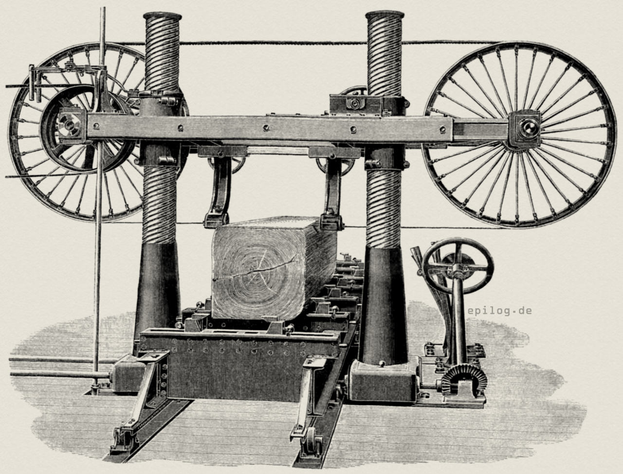Die Art, in welcher die Säge arbeitet, ist leicht verständlich aus der Zeichnung. Zwei drehbare Säulen, in welche mehrläufige steile Gewinde eingeschnitten sind, tragen den eigentlichen Sägemechanismus. Sobald ein Brett geschnitten ist und die Säge um die Dicke eines Brettes gesenkt werden soll, werden die Schraubensäulen durch das rechts sichtbare Handrad gemeinsam in Bewegung gesetzt, was um so leichter geschieht, da der schwere Sägemechanismus ohnehin das Bestreben hat, an den Schrauben hinabzugleiten.