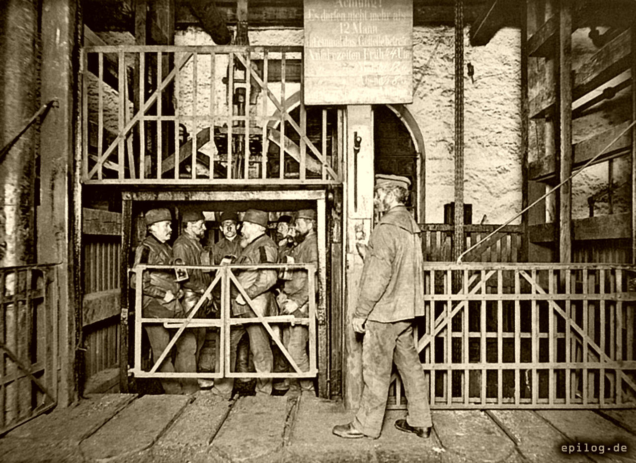 Soeben ist das Signal zur Einfahrt in den Schacht gekommen. Die Mannschaft hat sich am Kopf des Schachtes, der ›Hängebank‹, in das Fördergestell begeben, um an dem tragkräftigen Bandseil aus Gussstahl in die Tiefe hinabgelassen zu werden. Das Gestell ist überdies mit Fangvorrichtung versehen, die für den außerordentlichen Fall, dass einmal das Seil doch risse, in Dienst treten und jenes vor dem Hinabfallen bewahren würde.