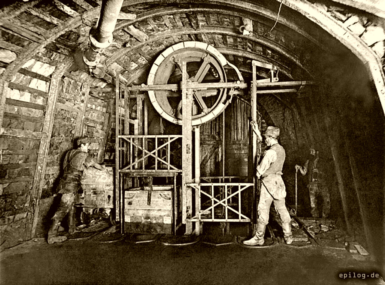 Dort, wo der Hauptquerschlag den Förderschacht erreicht, am ›Füllorte‹, gelangen die mit den Kohlen gefüllten Förderwagen auf das Fördergestell und dann, in diesem mittels der Fördermaschine gehoben, zu Tage.