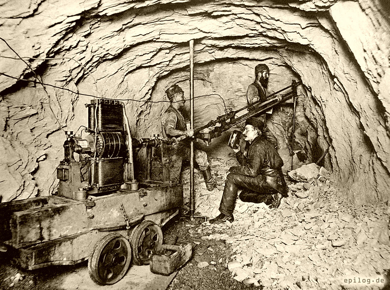 Die Bezeichnung ›schwarze Diamanten‹ hat man sich gewöhnt, in übertragener Bedeutung für die Steinkohlenschätze anzuwenden. Es gibt aber auch wirkliche Diamanten von grauer bis schwarzer Farbe, die um ihrer Härte willen so geschätzten ›Bohrdiamanten‹. Dichtem Koks gleichend, sind sie so unscheinbar als möglich. Aber in Stahlkronen eingesetzt und unter beständiger Wasserspülung bewegt, wirken sie gleich einer Säge, welcher kein Gestein zu widerstehen vermag. Und wie sie dem Geologen vermöge der Tiefbohrungen einen Einblick in das Gebirge oft in Tiefen von über 1000 m hinab vermitteln, so dienen sie hier dem Bergmann beim Betrieb eines Querschlages zur Herstellung von Gesteinssprenglöchern. Der Elektromotor, der den Strom von der oberirdisch aufgestellten Erzeugungsstation empfängt und durch ihn den Bohrer in rasche Umdrehung versetzt, lässt sich, wie man sieht, auf einem Radgestell leicht fortbewegen.