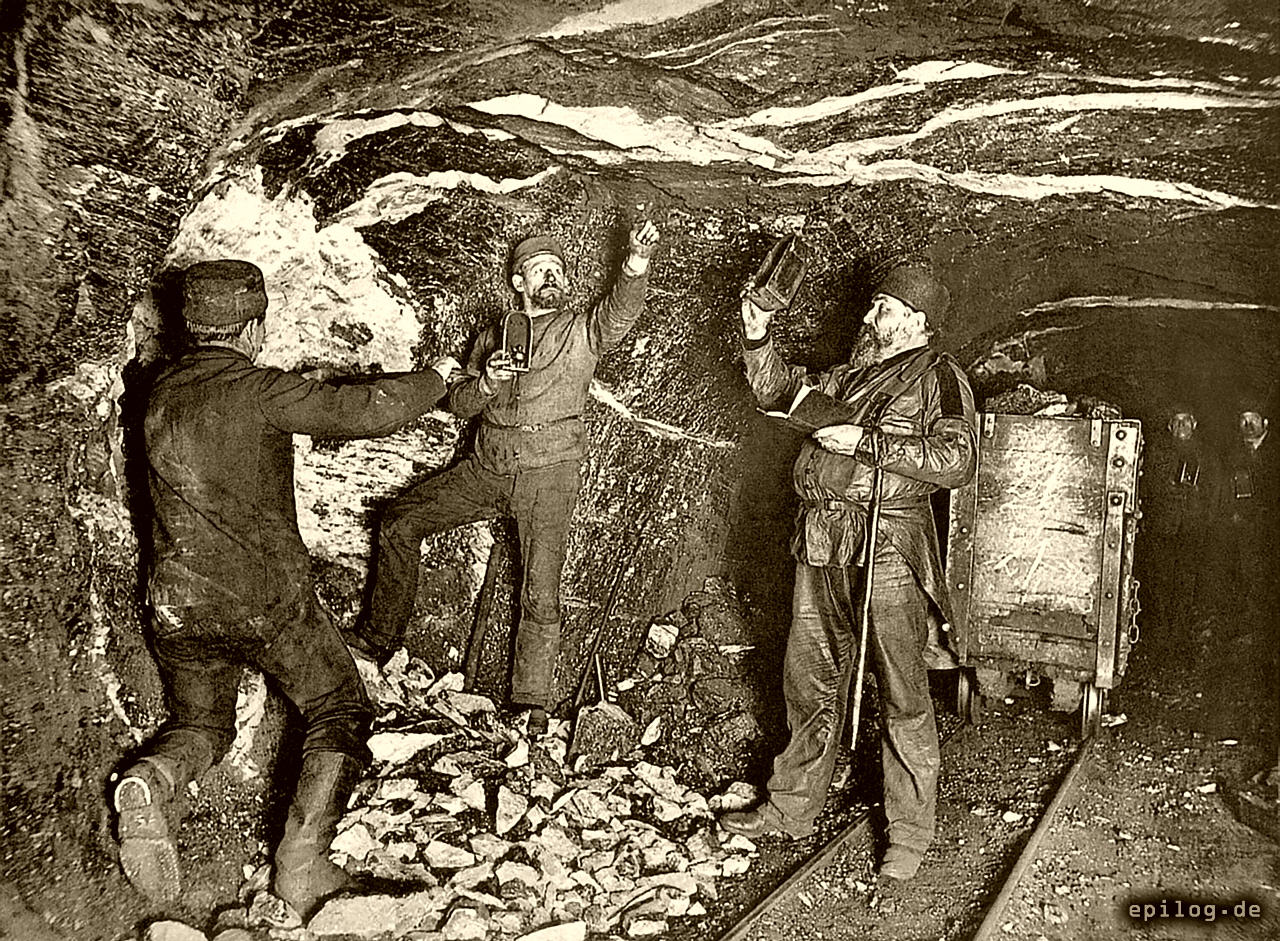 Der Obersteiger verhandelt mit den Arbeitern, wie viel sie für einen geförderten Wagen Kohlen, für ein Gezimmer, für die Raumeinheit der Gesteinsrücken (›Kämme‹) bezahlt bekommen sollen. Denn, wie das Bild zeigt, ist das Kohlenflöz nicht immer rein. Risse haben sich einst durch unterirdische Gewalten gebildet und sind dann mit taubem Gestein gefüllt worden. Auch mögen hier und da Fluten durch die noch ungefestigte Kohlenschicht geflossen sein und Geröllablagerungen in ihr hinterlassen haben. In jedem Fall aber erschweren diese Gesteinseinlagerungen die Gewinnung der Kohlen und müssen daher besonders entschädigt werden.