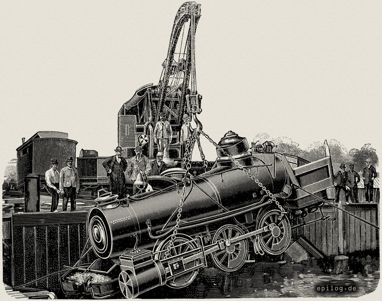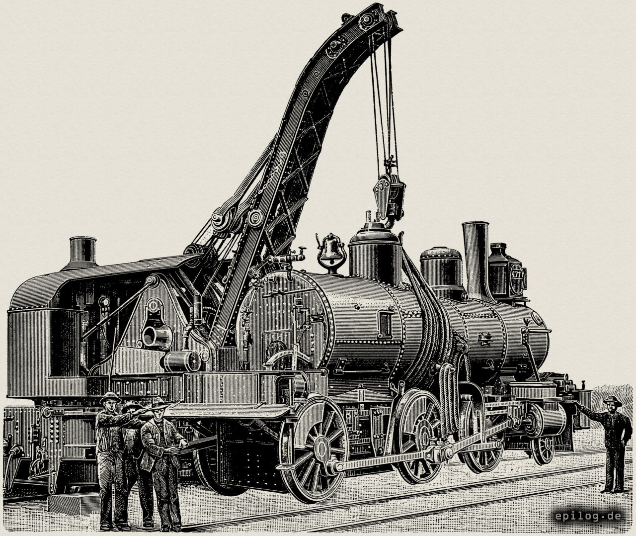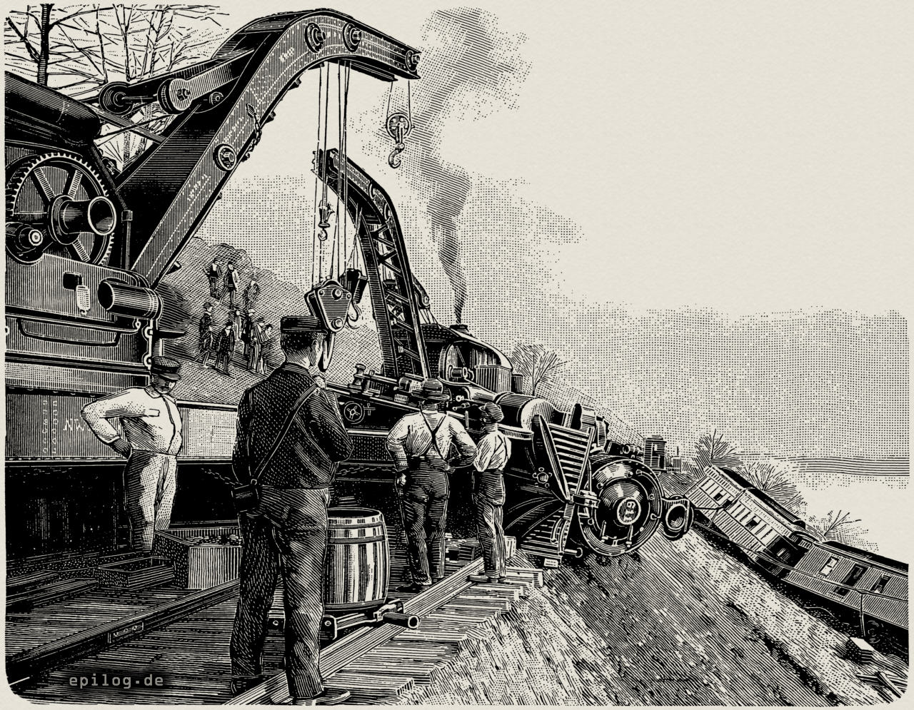 »Amerika, du hast es besser als unser Kontinent der alte«, wird der europäische Eisenbahnmann mit dem Dichter ausrufen, wenn er die gewaltigen Instrumente der Schienenräumung erblickt, die in unseren begleitenden Abbildungen bei der Entfaltung ihrer riesigen Kräfte wiedergegeben sind. Die Techniker der Vereinigten Staaten, gewohnt, die menschliche Kraft, wo nur immer angängig, durch die der Maschine zu ersetzen und die Leistungen der letzteren überall auf das höchste erreichbare Maß zu steigern, haben eine eigene Art von fahrbaren Kränen für Eisenbahnzwecke erfunden, die sie ›Wrecking cran‹ (Wrackhebemaschine) nennen und deren Kraft auch die schwersten überseeischen Lokomotiven bewältigt.