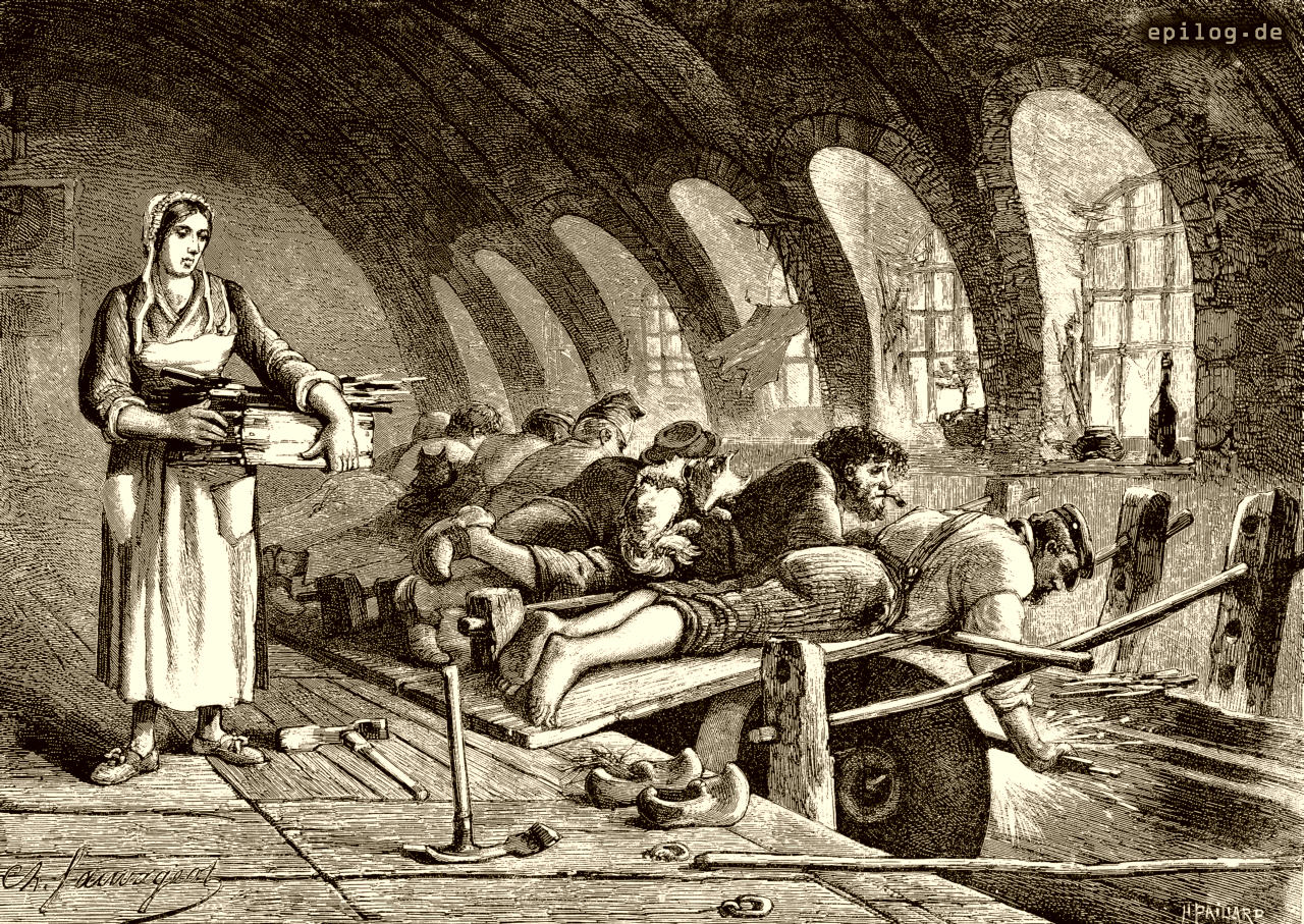 Sind die Klingen gewalzt, geschmiedet, keilförmig verjüngt und gehärtet, so werden sie geschliffen. Dies geschieht auf Schleifsteinen, welche wie Mühlsteine vom Wasser oder mit Dampf getrieben werden, und unter der Hand von Männern, welche eine eigene Zunft bilden. Die Messerschleifer haben bei der Arbeit das Schleifrad unter sich, das beständig mit Wasser befeuchtet wird. Unser Bild zeigt, in welcher Weise diese Arbeiter, auf dem Bauch liegend auf einem über dem Schleifrad befindlichen Brett, ihrem mühseligen und anstrengenden Beruf obliegen. Das Polieren der fertigen Messer geschieht mittelst ähnlicher Räder, die aber aus hartem Holz gedreht und mit Filz oder Büffelleder überzogen sind und auf welche man den in Öl angerührten Schmirgel aufträgt.