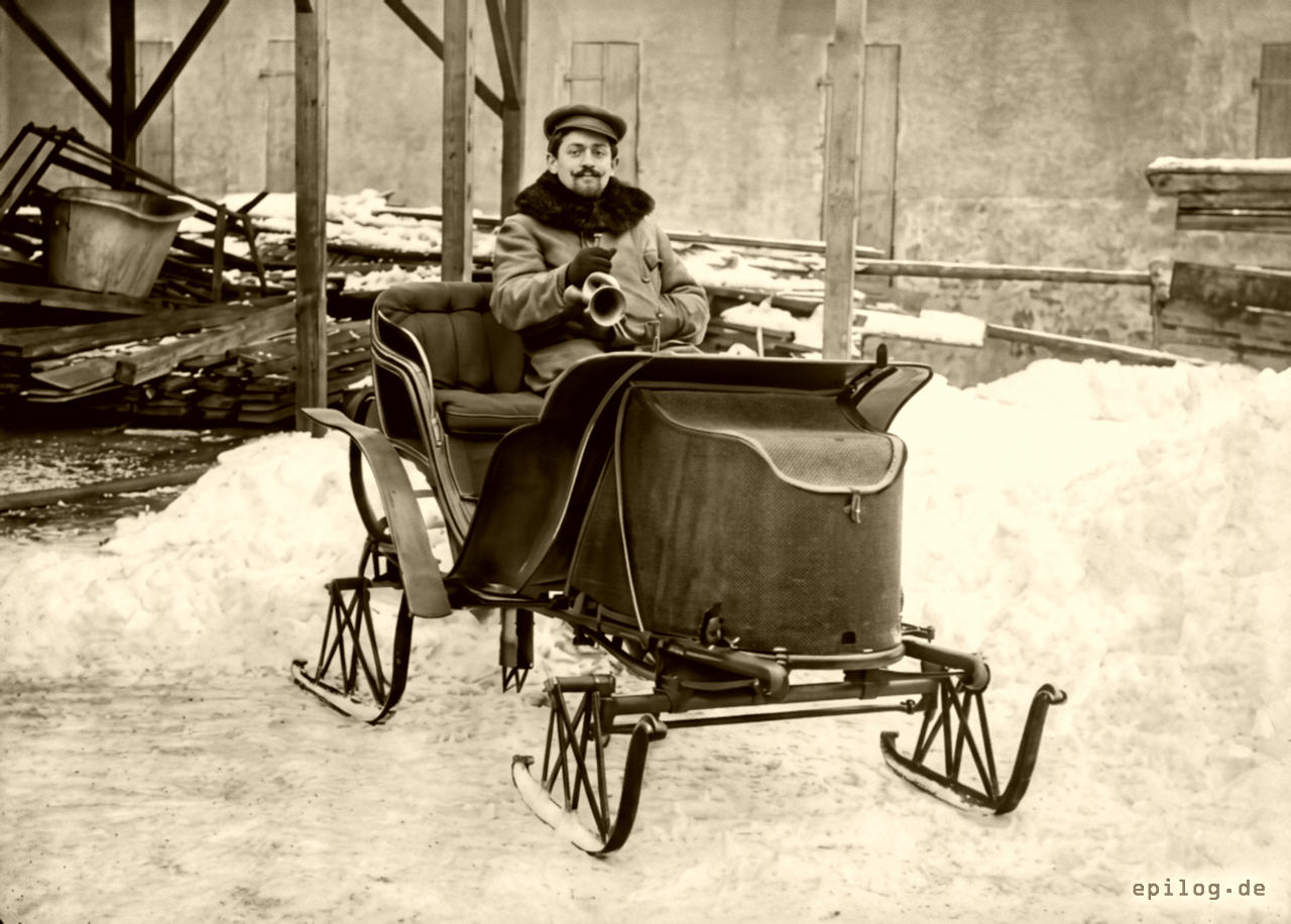 Der Motorschlitten wurde kürzlich in Nürnberg ausprobiert und soll zur Zufriedenheit seines Konstrukteurs funktioniert haben. An Stelle der Räder sind Schlittenkufen getreten, auf welchen das Fahrzeug mit großer Schnelligkeit und völlig ruhigem Lauf über die schneebedeckten Straßen dahineilte. Der Schlitten, eine neue Leistung des Ingenieurs Maurer von der Nürnberger Motorfahrzeug-Fabrik ›Union‹ vereinigt die allerneuesten Errungenschaften auf dem Gebiet der modernen Automobil-Industrie in sich, und jedem der zahlreichen Beobachter fiel die außerordentlich einfache Konstruktion der Maschinerie, verbunden mit eleganter, gefälliger Ausstattung, vorteilhaft ins Auge. Leider ist uns die Fotografie ohne nähere Beschreibung der maschinellen Anordnung zugegangen, so dass wir uns diesbezüglich auf das Erraten verlegen müssen. Der Motor ist offenbar vorn in dem gitterartigen Gehäuse untergebracht. Unter dem Sitz sieht man eine mit Zacken versehene Vorrichtung, die wahrscheinlich den Antrieb darstellt. Die Fortbewegung des Fahrzeuges dürfte in der Weise erfolgen, dass eine Welle, die einen Kranz der vorerwähnten zackigen Arme besitzt, zur Rotation gebracht wird. Die in den Schnee eingreifenden Zacken schieben das Fahrzeug nach vorn. Die Lenkung erfolgt in derselben Weise wie die der Vorderräder eines auf Rädern laufenden Automobils durch Winkelachsen. Diese Vorrichtung ist dadurch ermöglicht, dass der Konstrukteur statt zwei Schlittenkufen deren vier angebracht hat.