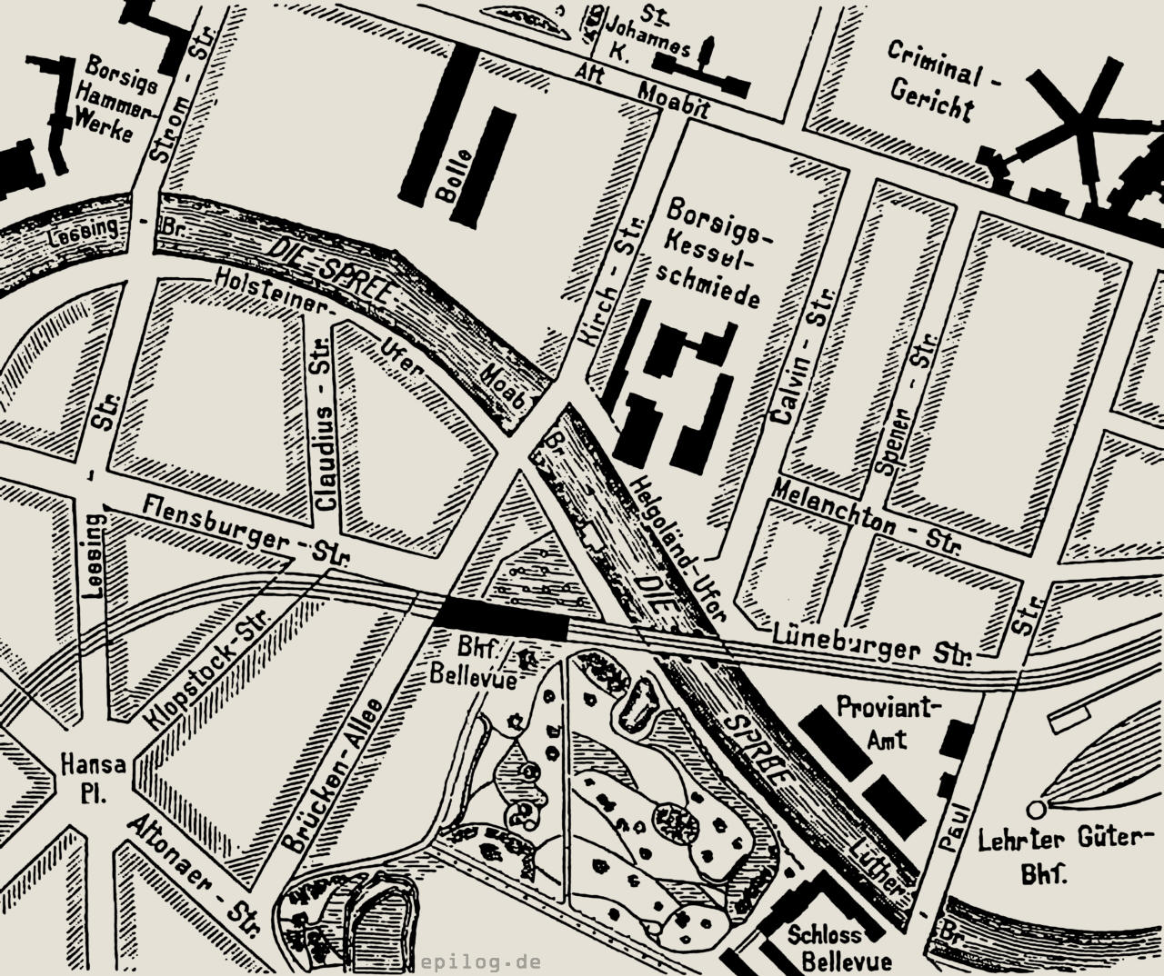 Abb. 1. Lageplan. Sie war eine schlichte, 7,5 m breite hölzerne Brücke, welche den etwa 70 m breiten Strom auf 12 Pfahljoche überschritt. Nicht ganz in der Mitte, mehr nach der Moabiter Seite zu, war eine 8,8 m weite Schiffsdurchfahrt mit zwei Zugklappen überdeckt, welche im geschlossenen Zustand allerdings nur 1,83 m über dem höchsten Wasserstand lagen. Im Jahr 1860 wurde die Fahrbahn um 1,50 m höher gelegt – der erste derartige Fall in Berlin – und die Klappen beseitigt. Dem starken Lastwagenverkehr bot die alte Brücke gegen seitliches Schwanken schon lange wenig Widerstand, so dass der Ersatz dieser nunmehr glücklicherweise in Berlin bald ganz der Vergangenheit angehörigen Brückenform durch einen massiven und würdigen Bau längst zu einer zwingenden Notwendigkeit geworden war.