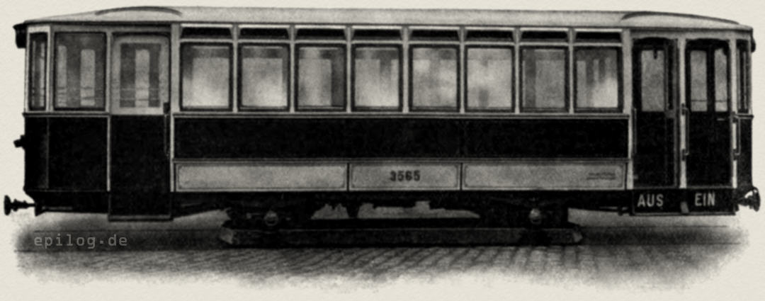 Beiwagen Typ ›m‹ der Gemeinde Wien – städtische Straßenbahn. Zuerst wurde diese Anordnung bei den Anhängewagen getroffen; für den Abschluss der gegen die Brustwand zu liegenden Einsteigöffnung wurde eine gegen das Wagenende zu drehbare Klapptür verwendet, während die Aussteigöffnung durch ein niederes drehbares Gitter abschließbar ist, welches in geöffnetem Zustand eine Scheidung der kommenden und gehenden Fahrgäste auf der Plattform besorgt. Auf der gegenüberliegenden Seite der Plattform befindet sich ein mit einer Schiebetür abschließbarer Notausgang. Die Klapptür ist nicht ganz einfach zu handhaben, nimmt im geöffneten Zustand ziemlich viel Platz in Anspruch und gibt viele Erhaltungsarbeiten; die Verwendung des Drehgitters für den zweiten Abschluss hat den Nachteil, dass die Plattform, welche sonst ganz abschließbar ist, was auf der vorderen Plattform in Betracht kommt, an der einen Stelle offenbleiben muss. Im Winter und bei schlechtem Wetter ist das sehr unangenehm, insbesondere deshalb, weil die aus dem Wageninneren zur vorderen Plattform führende Tür den Zu- und Abgang für die Fahrgäste bildet.
