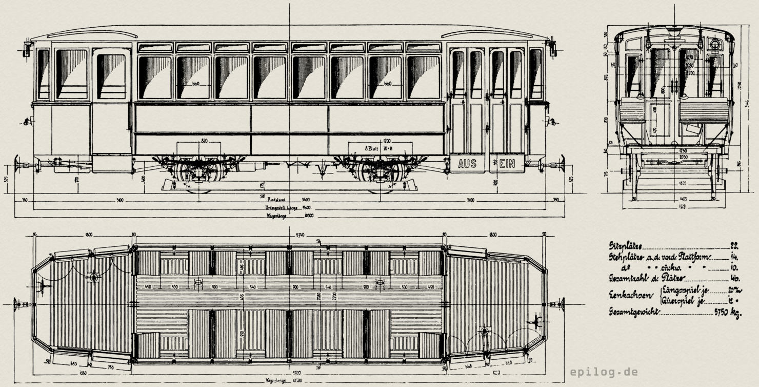 Im Übrigen sind die Abmessungen der Wagen nicht viel von jenen der zuletzt bestellten Anhängewagen verschieden und ergeben sich aus den Abbildungen; aus diesen ist auch ersichtlich, dass die bisher bei den Anhängewagen verwendete Dachlaterne weggelassen und so wie bei den letzten Motorwagen ein Tonnendach angewendet worden ist. Diese neuen Anhängewagen haben bei einer Länge von 9,6 m (über die Brustwände gemessen) und einer Breite von 2,2 m insgesamt 22 Sitzplätze und 24 Stehplätze, deren Zahl in außergewöhnlichen Fällen auf 40 erhöht werden kann, so dass sich der höchste Fassungsraum zu 62 Personen ergibt.