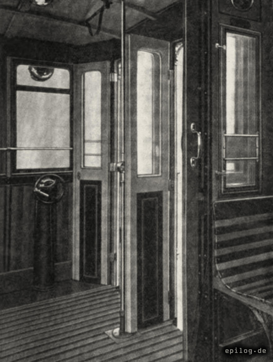 Für die neu in Bestellung kommenden Anhängewagen wurde über Vorschlag des Verfassers der Abschluss des Doppelein- und -ausstiegs durch zwei nebeneinanderliegende zweiflügelige Drehtüren vorgesehen. Die zwei äußeren Flügel schlagen einerseits gegen die Kastenwand, anderseits gegen die Brustwand an, die beiden inneren Flügel aber sind an die mittlere Säule angelenkt und stehen im geöffneten Zustand nur wenig in die Plattform hinein, was vollständig ausreichend für die Trennung der kommenden und gehenden Fahrgäste ist, dabei aber die freie Beweglichkeit auf der Plattform in keiner Weise behindert. Die ganz an die Wand gedrückte Handbremse mit einem vertikalen Griffrad trägt auch zur Erweiterung der gegen die älteren Wagen etwas verlängerten Plattform bei.