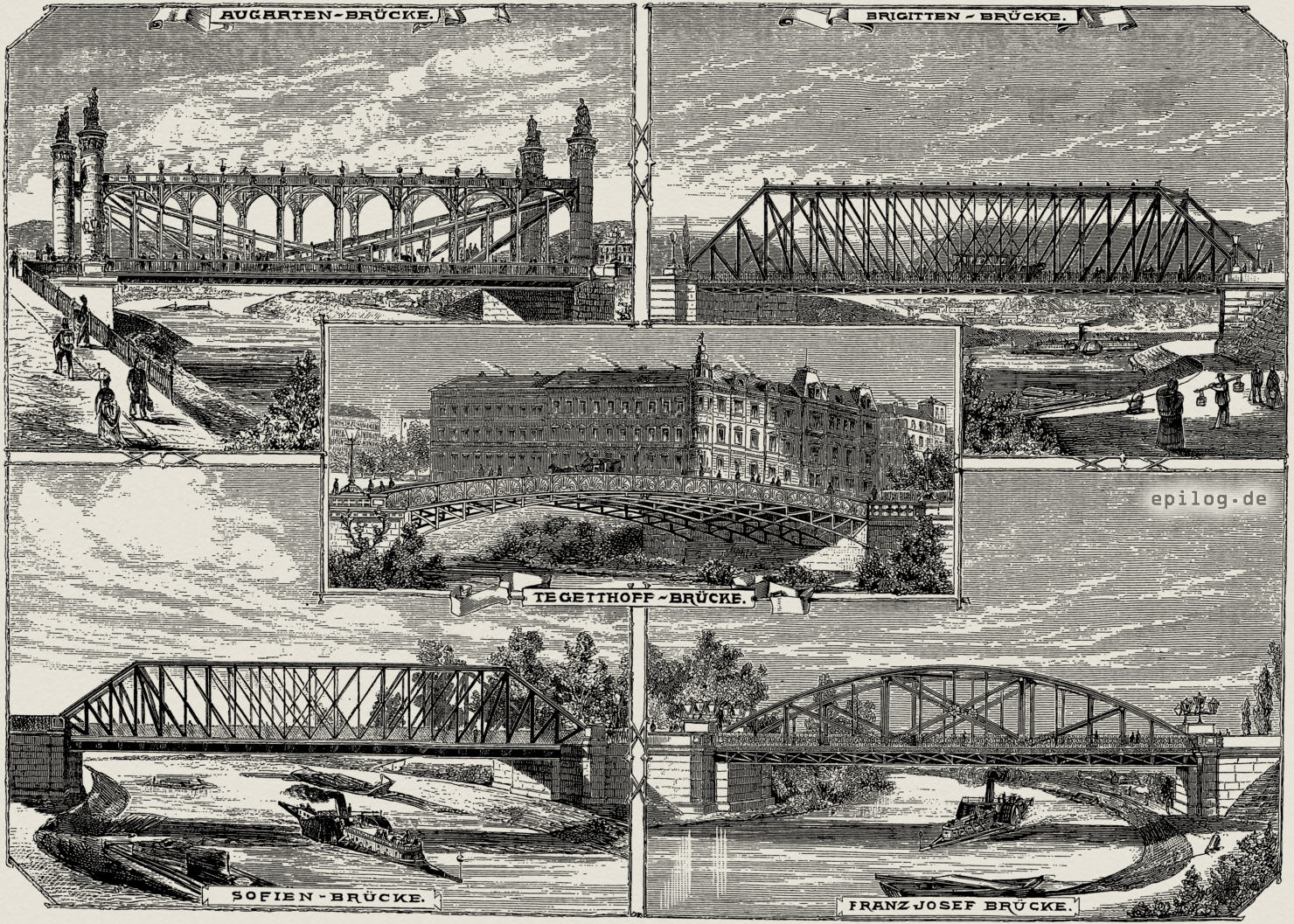 Eine Anzahl der Brücken, zudem die zierlichsten und bedeutendsten fünf, hat der Zeichner des vorliegenden Bildes wiedergegeben. Was Größe und Zierlichkeit vereint betrifft, verdient die Augartenbrücke über die Donau den Vorrang. Die Eisenkonstruktion bei großen Spannweiten hat überall den Sieg davon getragen; und nicht so zierlich, aber derber und sehr tragfähig, da auch die Pferdebahn über sie zieht, ist die Brigittenaubrücke. Diese verbindet die früher ganz isoliert gewesene Brigittenau mit dem Alsergrund-Bezirk und jenem Landstriche auf dem rechten Donauufer, welcher die reizenden Bergpartien Wiens, den Kahlen- und Leopoldsberg enthält. Auch ist damit eine notwendige Kommunikation zwischen Nordbahn und Franz-Josephs-Bahn geschaffen, welche letztere, an dem rechten Donaugelände aufwärts ins Land laufend, eine hohe Bedeutung hat und täglich mehr gewinnt.