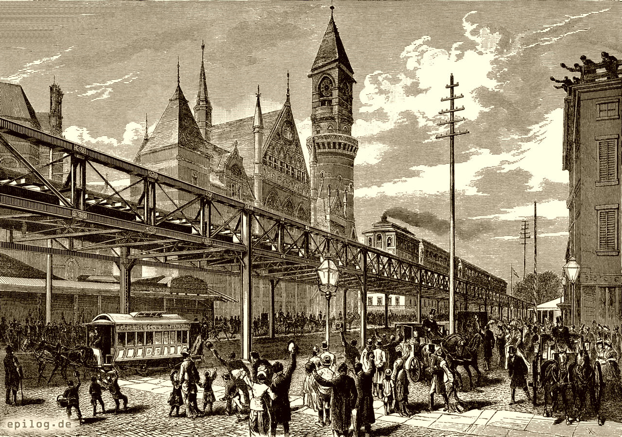 Es ist weder eine neue Erfindung, noch eigentlich ein Kulturfortschritt zu nennen – das Werk, mit dem wir uns heute beschäftigen wollen; gleichwohl ist die neue Verkehrskonstruktion der New Yorker Hochbahnen wichtig genug, uns die Pflicht aufzuerlegen, unser Publikum damit bekanntzumachen. Innerhalb weniger Monate wird die Stadt New York mit einem neuen Netz von Eisenbahnen versehen sein, welches eine Länge von gegen 35 km umfasst und oberhalb der gewöhnlichen Tramwaylinien ungefähr in der Höhe des zweiten Stockes der Häuser errichtet ist. Die rapide Vermehrung des Straßenverkehrs in New York, welcher jährlich über hundert Millionen Passagiere erreicht, verursachte schon seit einigen Jahren so häufige Stauungen in den Straßen, die Menschenmengen konnten zuletzt so ungenügend von den Tramways und den Fuhrwerken befördert werden, dass man auf neue Mittel sinnen musste, die Massen zu bewältigen und die Hauptpulsadern des städtischen Verkehrs wieder in ungehinderten Gang zu bringen.