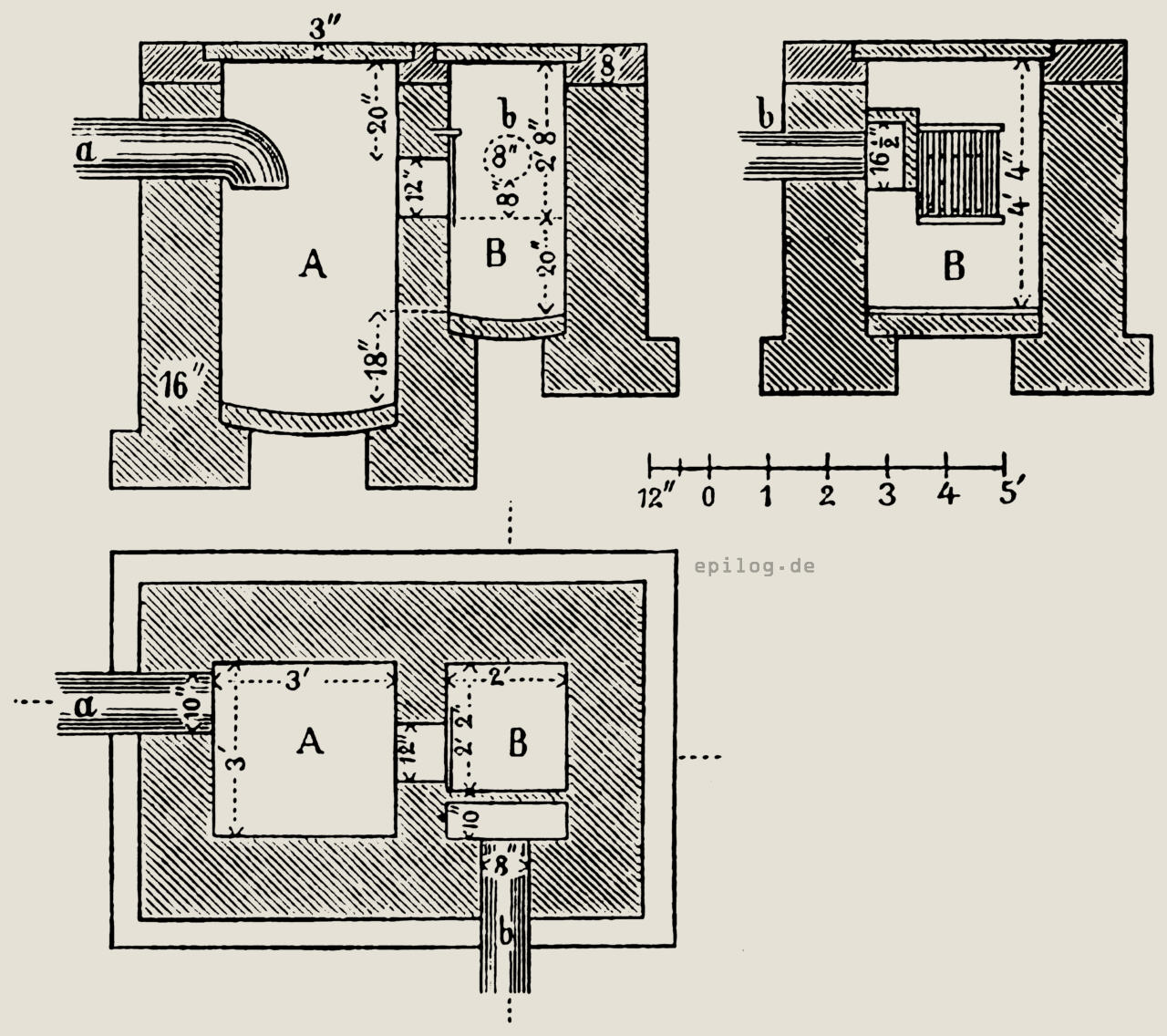 Eine solche Senkgrubenanlage, wie sie nachstehend im Grundriss und zwei Durchschnitten mitgeteilt wird, besteht aus der Sammelgrube (A), in welche die Zuleitung (a) mündet, und der Ableitungsgrube (B), aus welcher das Ableitungsrohr (b), vor dem sich ein gemauerter Wasserverschluss befindet, nach dem Kanal führt. Beide Gruben sind durch eine Öffnung verbunden, die durch ein Gitter, dessen Stäbe in höchstens 2,5 cm Zwischenraum auseinander stehen dürfen, verschlossen wird. Sämtliche Maße der Anlage sind aus den Zeichnungen zu ersehen. Das Mauerwerk muss in guten Klinkern mit Zementmörtel ausgeführt und im Inneren mit Zement verputzt werden; die Abdeckung erfolgt mit Hausteinschwellen, die eine Einlage von hölzernen Bohlen erhalten. Das Ableitungsrohr, das aus Metall oder Ton bestehen muss, darf in den Kanal nur unter dem Gewölbe, andererseits mindestens 45 cm über der Sohle desselben einmünden.