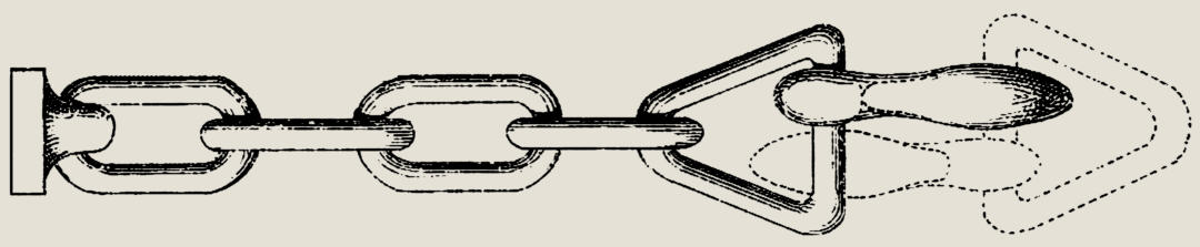 Die Abbildung zeigt eine einfache Notkupplungskette mit Haken, wie solche an den Personenwagen der Rheinischen Eisenbahn angebracht sind. Es hat dieselbe nichts besonders Bemerkenswertes, als dass das letzte Glied vor dem Haken dreieckig gebogen ist, und dass diese Kette jedes Mal nur einfach, und zwar in der Mitte unter den gewöhnlichen Federkupplungshaken an jedem Ende eines Wagens in einer Bohrung von einer starken eisernen Schiene, welche unter den Querschwellen des ganzen Wagens durchläuft, hängt.