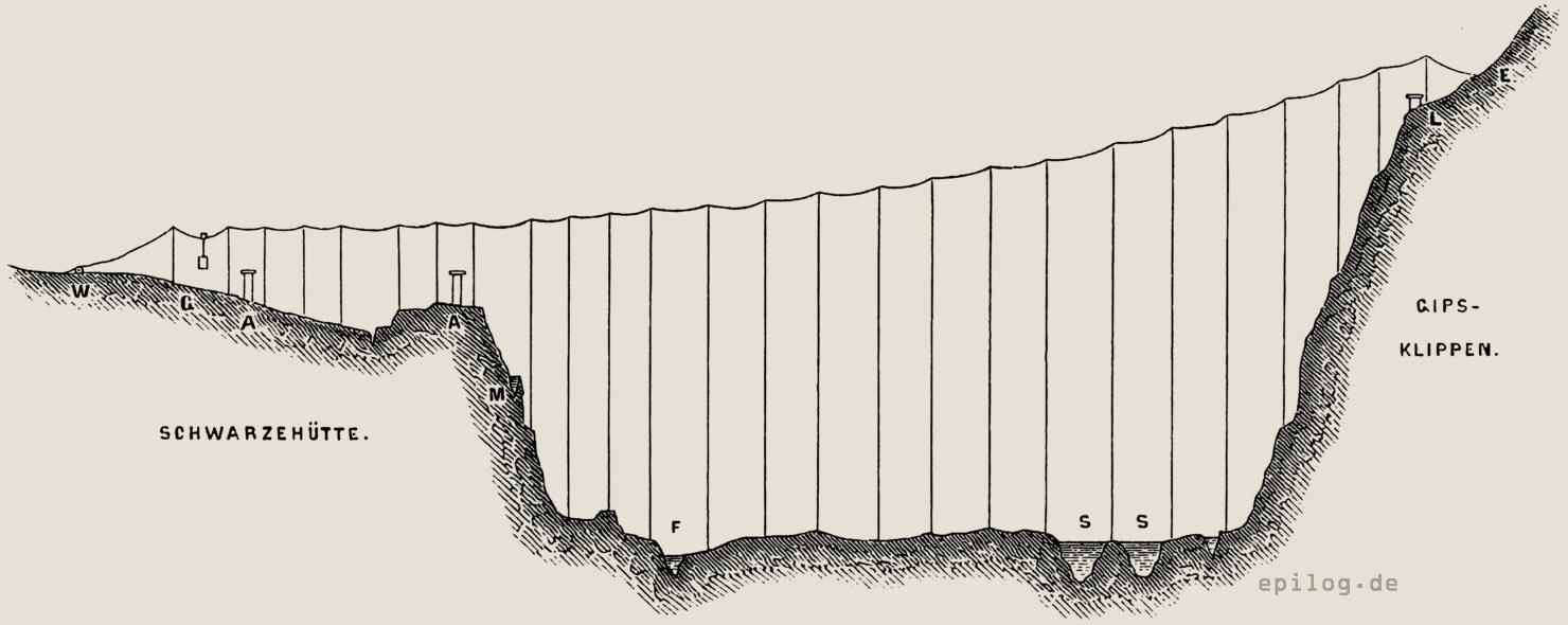 Das Gipswerk Schwarzehütte bei Osterode am Harz, der Firma Büchting & Schimmler gehörig, bezieht seine rohen Gipssteine aus in der Nähe liegenden Gipsklippen, welche von dem Werk durch das Tal der Söhse getrennt sind. Die Fuhrwerke, welche zum Transport des Rohmaterials dienten, hatten daher etwa 6 m hinab und nach Überschreitung des Flusses 5 – 6 m hinaufzusteigen. Dabei wurden die Steine aus dem höher gelegenen Teil des Bruches bis zu einem Plateau hinabgestürzt, welches dem Fahrwege nach etwa 440 –480 m vom Gipswerke entfernt liegt.