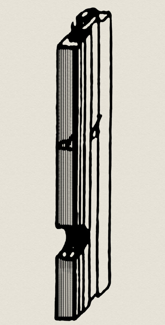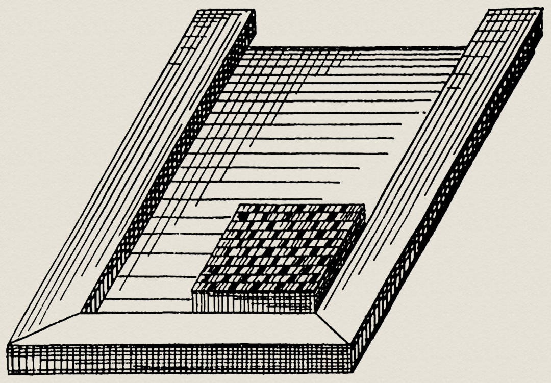 Das Material, mit dem der Setzer arbeitet, die Lettern oder Typen, sind Metallstäbchen (Abb. 1) von rechteckigem Querschnitt, alle von gleicher Länge, gleicher Breite, aber verschiedener Dicke, oberhalb mit einem erhabenen, umgekehrten Buchstabenbild versehen. Die Dicke hängt von der Weite des Buchstabenbildes ab, das die Letter trägt, und ist deshalb eine andere für ›w‹ z. B. als für ›i‹. Diese Lettern liegen buchstabenweise in den einzelnen Fächern eines mit Abteilungen versehenen sogenannten Setzkastens (Abb. 2).
