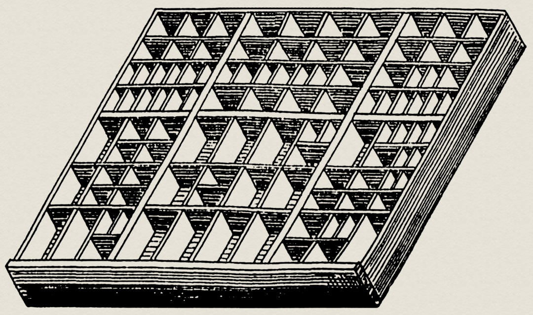 Abb. 2. Setzkasten. Nach Maßgabe des Manuskripts ergreift nun der vor dem Kasten stehende Setzer mit der rechten Hand nacheinander die einzelnen Buchstaben und fügt sie zur Zeile, einen an den anderen, in den mit der linken Hand gehaltenen sogenannten Winkelhaken, einen oberhalb und an einer Längsseite offenen Behälter (Abb. 3). Die eine bewegliche Seitenwand desselben ist verstellbar und wird der beabsichtigten Zeilenlänge entsprechend festgestellt.