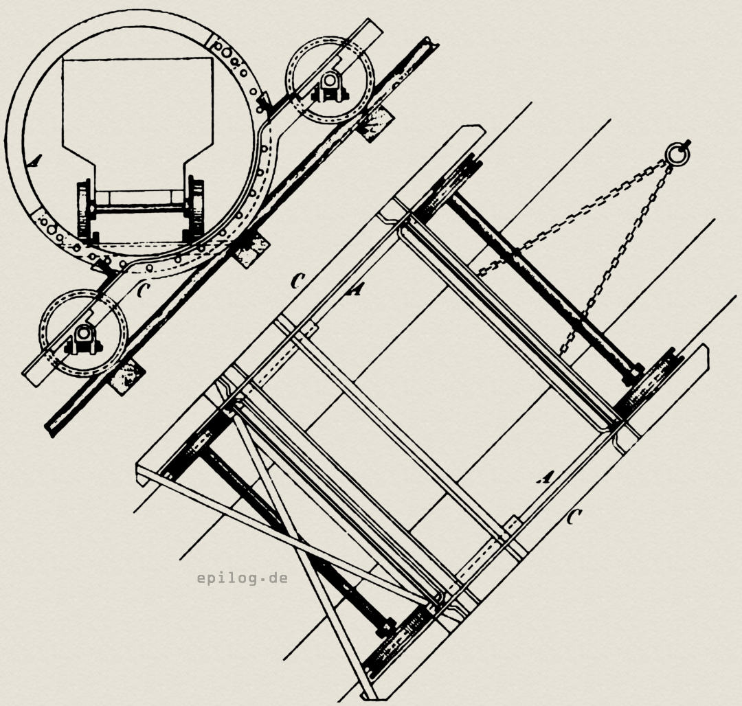 Bei der skizzierten sinnreichen Anordnung von M. Neuerburg, Zivilingenieur in Köln, besteht das Fördergestell aus zwei Teilen, dem eigentlichen Wagen C, in welchem die zwei Laufachsen gelagert sind und dessen Konstruktion von dem Neigungswinkel unabhängig ist, und dem eigentlichen Fördergefäßträger A, welcher aus zwei mit einander verstrebten Winkelringen besteht, die gewissermaßen einen Zylinder (oder auch Halbzylinder bilden), welcher quer über das Fördergestell gelegt wird, dessen Rahmen den Winkelringen entsprechend kreisförmig ausgebogen ist. Zwischen den Winkelringen ist ein Schienenpaar zur Aufnahme des zu fördernden Hundes befestigt, und es kann nun dieser Tragzylinder beliebig auf dem Fördergestell verdreht werden, bis die Tragbahn horizontal zu stehen kommt. In dieser Stellung wird dann der Tragzylinder mit dem Rahmen des Fördergestelles verschraubt, und die ganze Konstruktion fungiert genau wie die älteren Bremsberg-Fördergestelle.