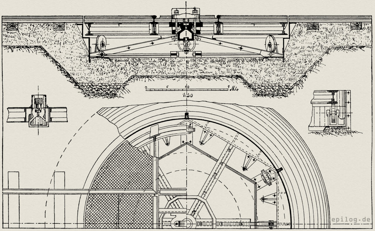 Zur Erzielung eines leichten Ganges wird das Prinzip befolgt, dass der Mittelzapfen den größten Teil der Belastung aufnimmt und die Laufrollen nur einen geringen Teil tragen. Die Auflagerfläche des Fundament-Kranzes ist so bemessen, dass sie bei etwaigem Setzen des Bodens in erster Linie bequem und ohne großen Zeitaufwand unterstopft werden kann, andererseits aber auch einer eventuellen Konzentration des Drucks noch eine genügende Auflagerfläche bietet.
