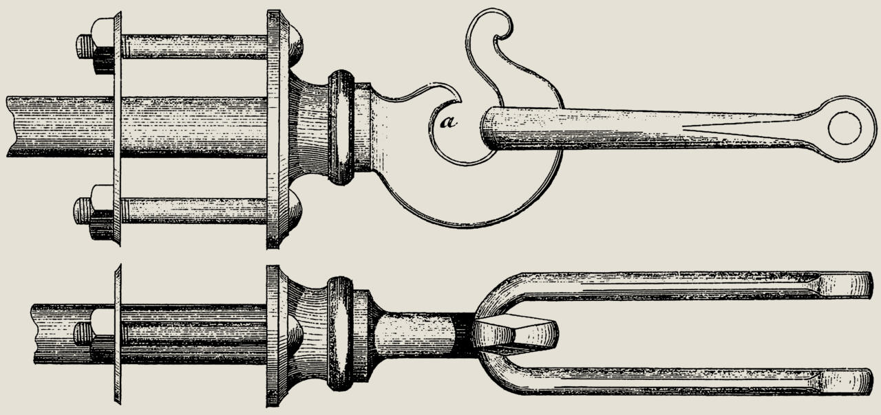 Dieser Kupplungshaken ist hier in zwei Ansichten mit dem Kupplungsbügel abgebildet, er zeichnet sich besonders durch seine gefällige Form und die richtigen Stärkeverhältnisse, sowie dadurch aus, dass ungeachtet er keine Sperrfeder hat, die mit ihm versehenen und gekuppelten Wagen sich nicht aushängen können.