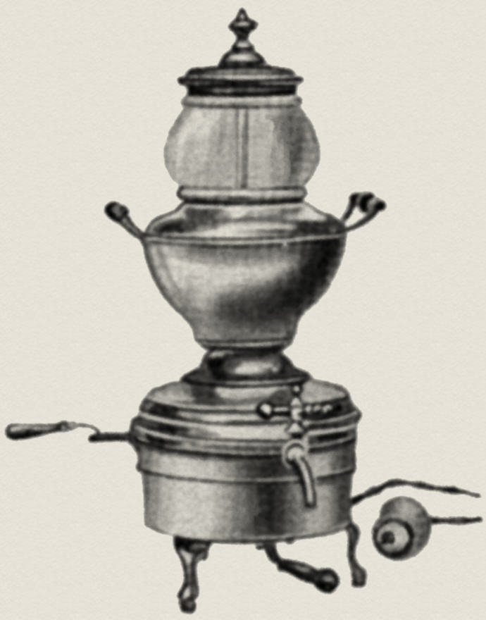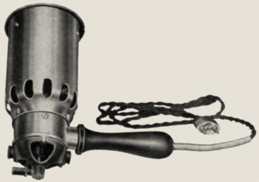 Elektrische Wärmeplatte (Rechaud), vernickelt, zum Warmhalten von Speisen etc. Liegt auf ihrem Toilettentisch eine elektrische Brennschere? Es gibt jetzt solche, die die Heizspirale direkt in den Schenkeln tragen und die man deshalb direkt an die Leitung anschließen kann. Oder der neue Haartrockner, ein höchst handlicher Apparat, der einen heißen, starken Luftstrom erzeugt? Habt Ihr noch keinen Versuch gemacht mit den hübschen Rechauds aus Nickel? Ihr brauchtet eine Omelette soufflé nicht kalt werden lassen. Den Tee, den Kaffee oder die Milch könntet Ihr auf dem Frühstückstisch selbst zubereiten, ohne immer jemand hochnotpeinlich für das Aufsetzen der Wärmemütze verantwortlich zu machen. Und könntest Du nicht einen Schnellwasserwärmer in Küche und Sprechzimmer gut brauchen?«