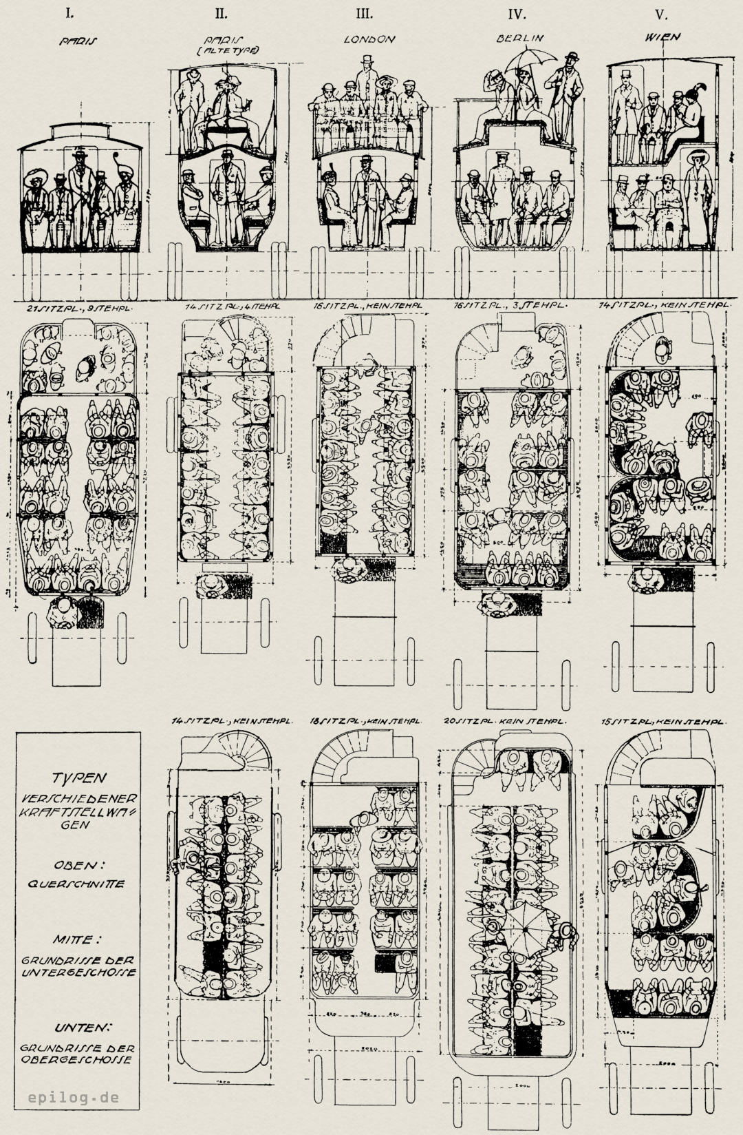 In Ergänzung des am 5.10.1913 erschienenen Berichtes über Wiener Kraftstellwagen mit gedecktem Obergeschoss nach dem Entwurf des Verfassers dürfte eine Zusammenstellung über die Abmessungen und die Platzverteilung bei den in verschiedenen Großstädten gebräuchlichen Kraftstellwagen von Interesse sein. In der beigegebenen Zeichnung Abb. 1 sind die in dem vorgenannten Aufsatz erwähnten und beschriebenen Ausführungen einander gegenübergestellt; in die Abb. 1 sind die sitzenden und stehenden oder gehenden Fahrgäste eingezeichnet, wobei für die Personen eine mittlere Höhe von 1,65 – 1,70 m angenommen wurde.